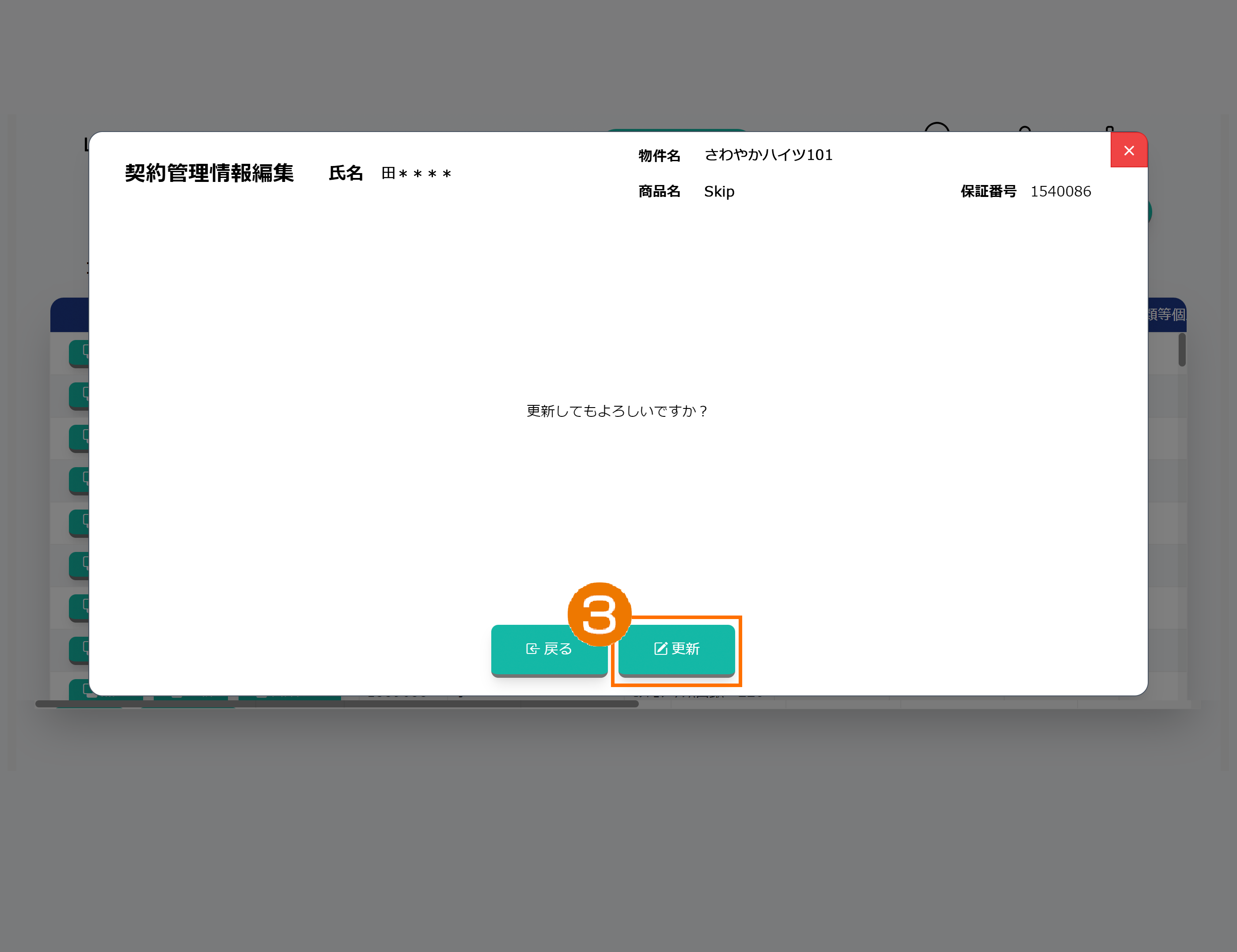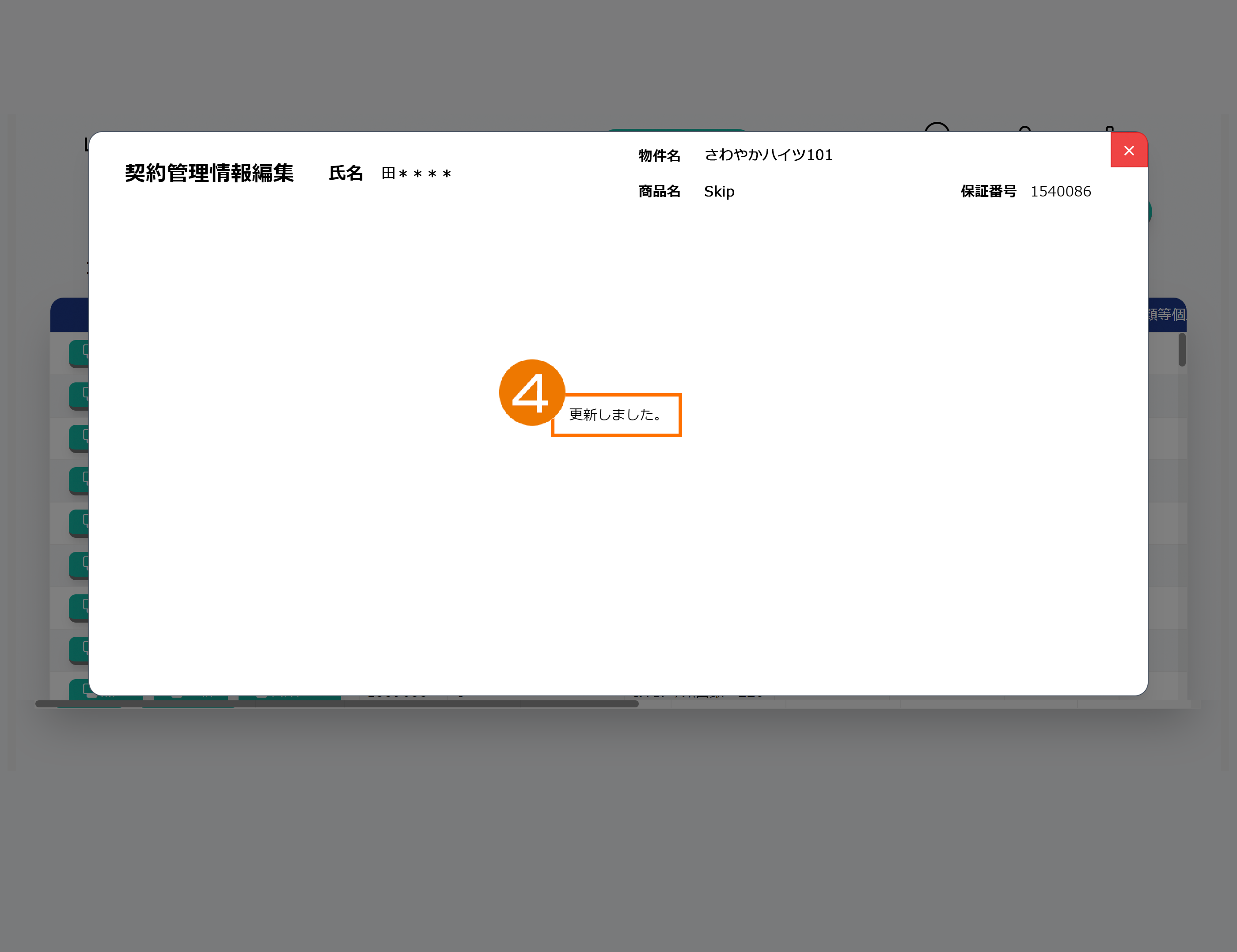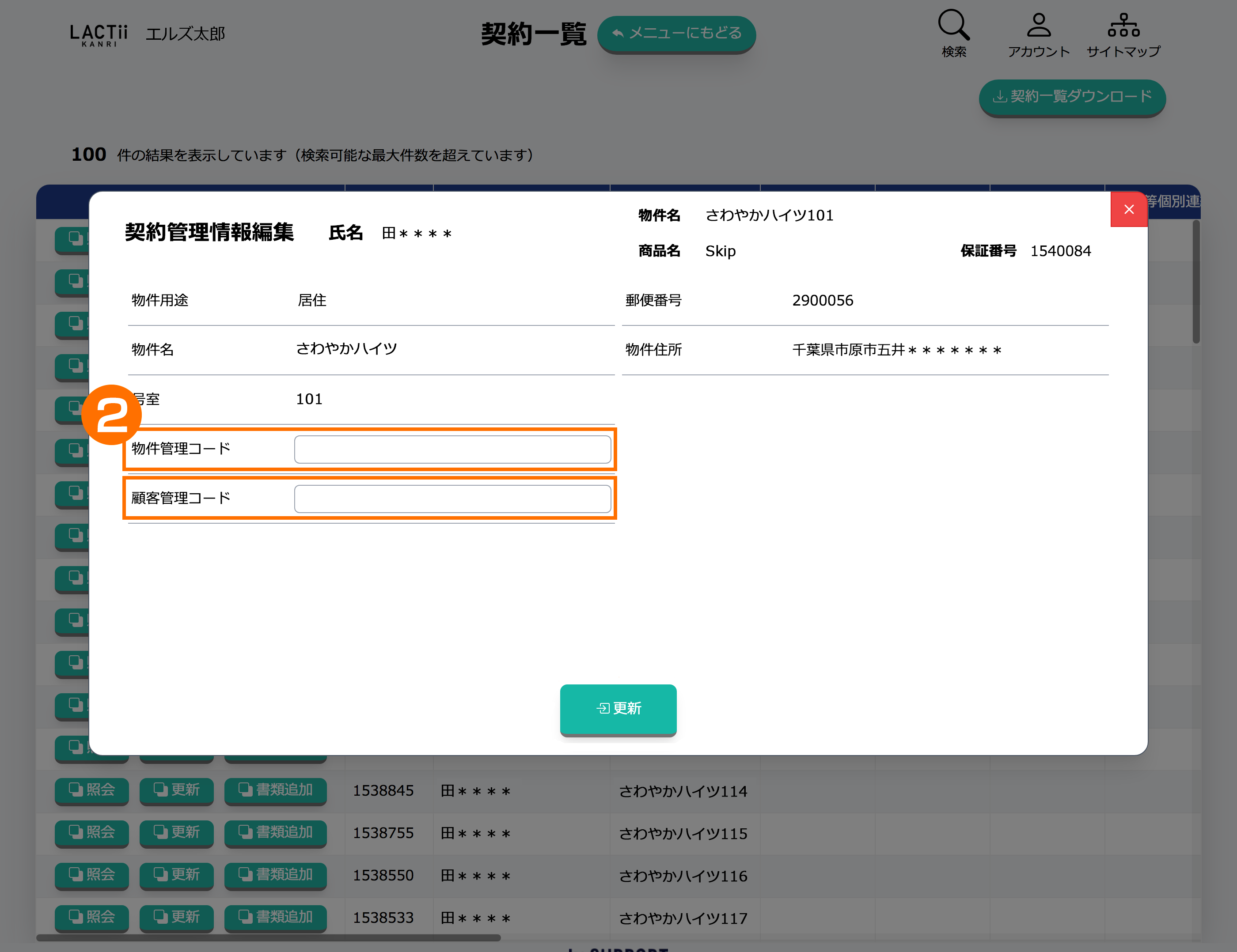 「物件管理コード」、「顧客管理コード」へ入力し、更新ボタンを押します。