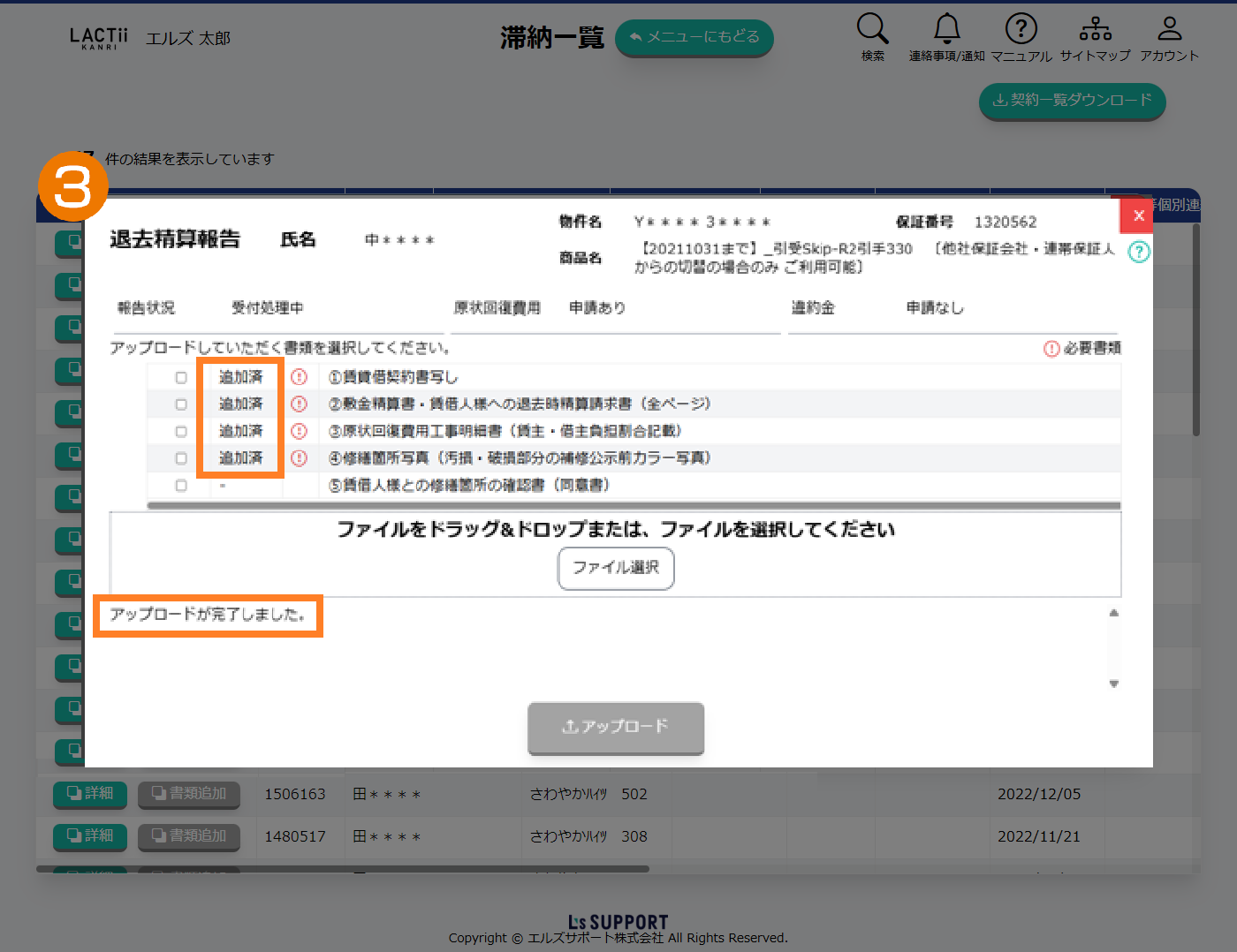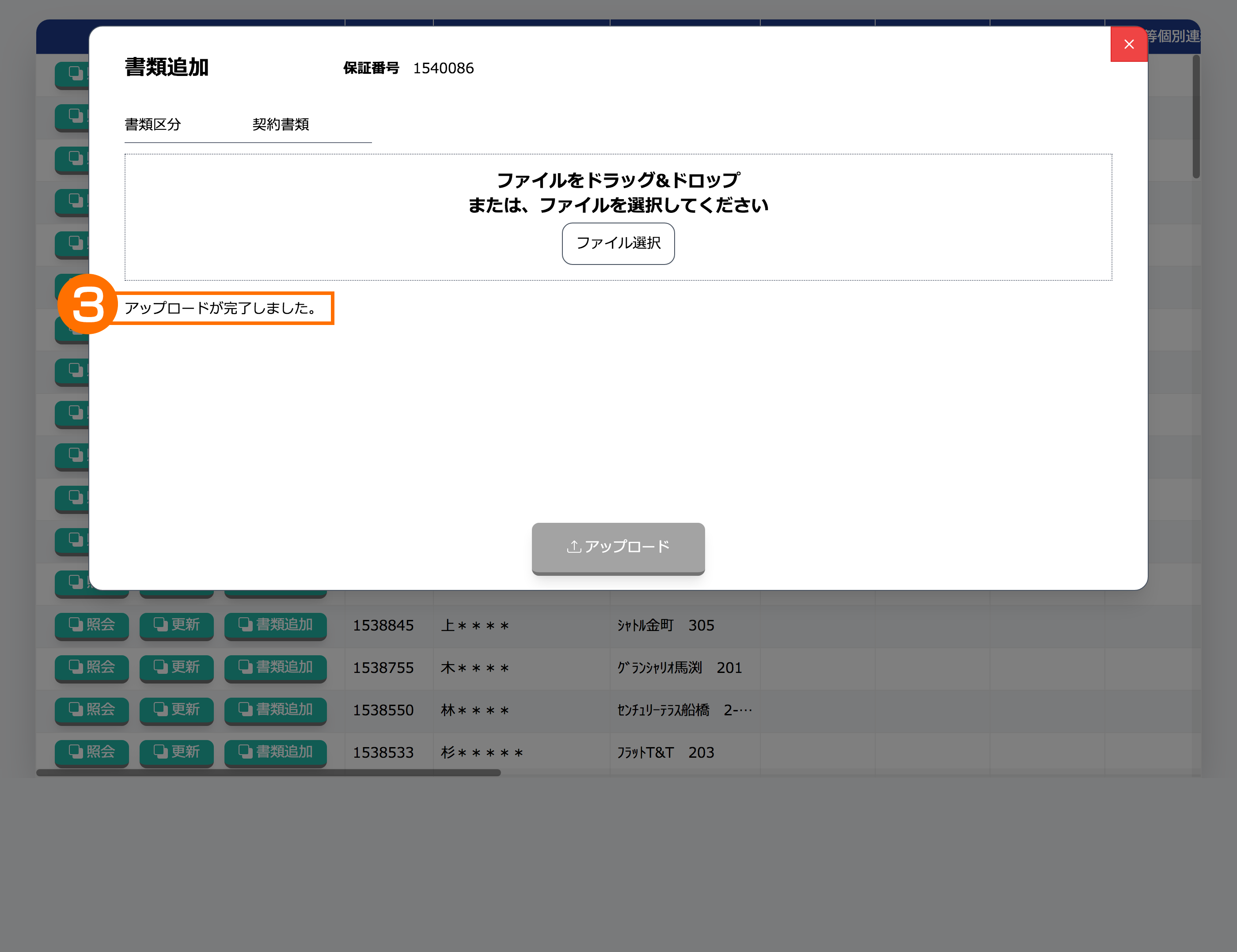 アップロードが完了しました。のメッセージとアップロードいただいた書類が『追加済』になっていることをご確認ください。