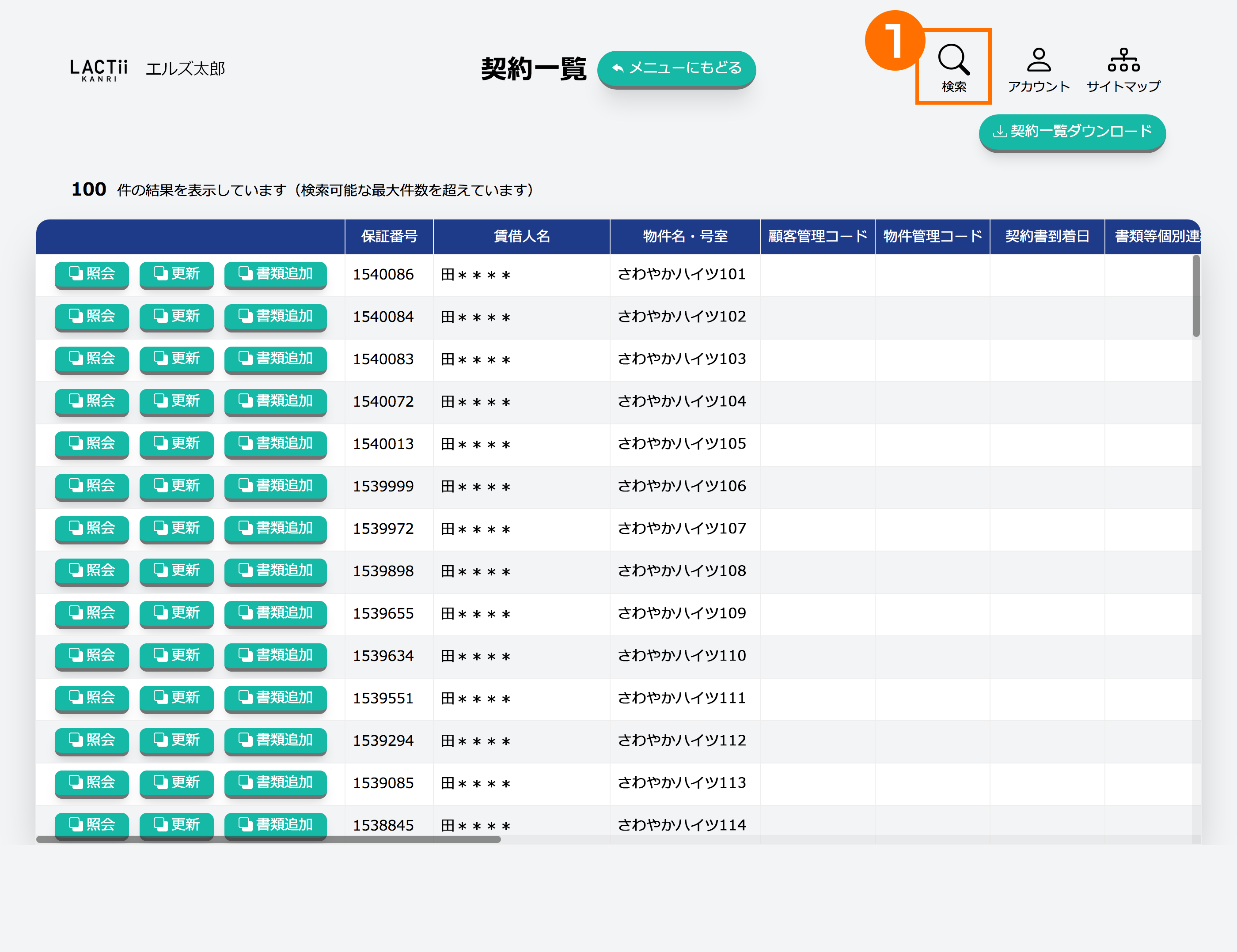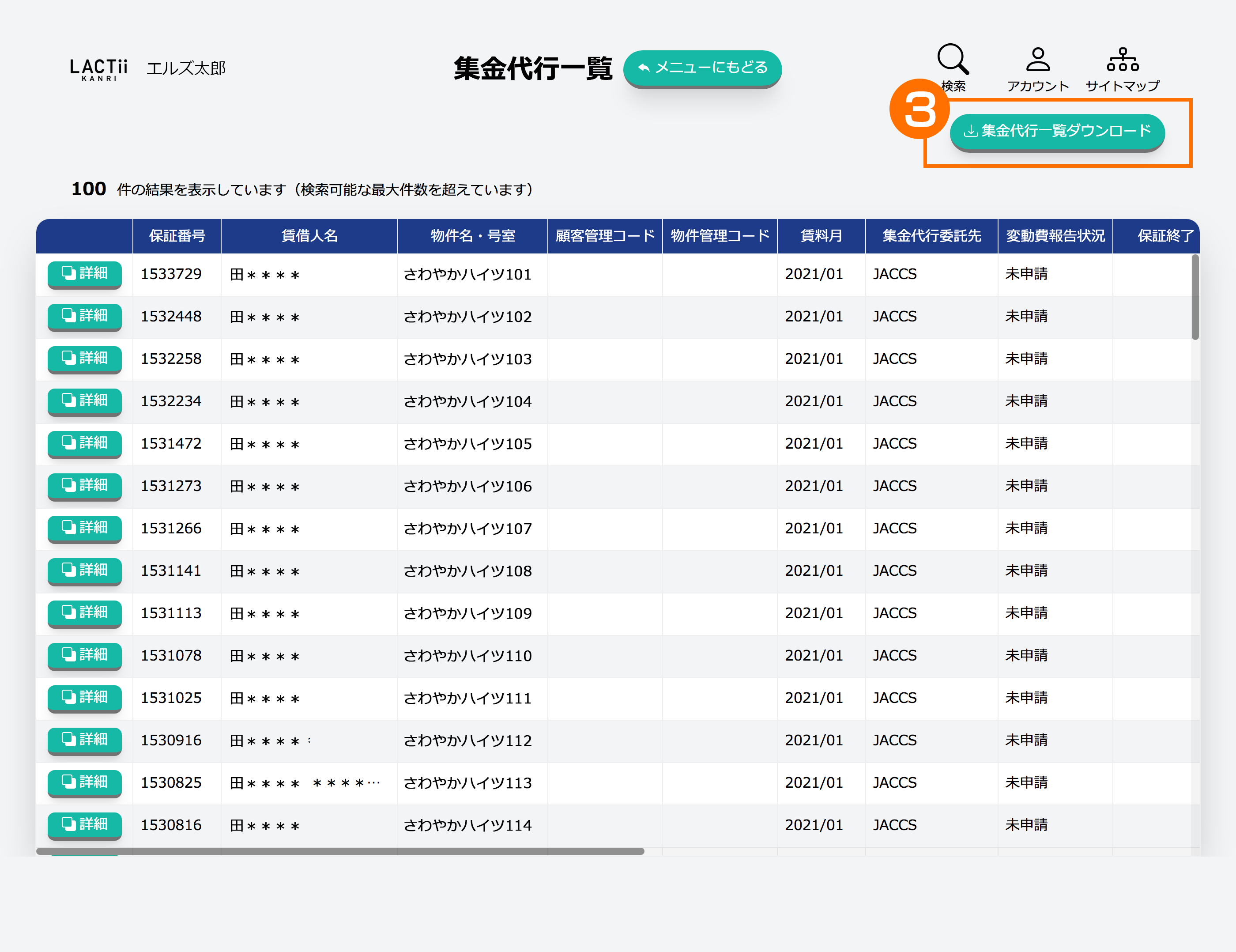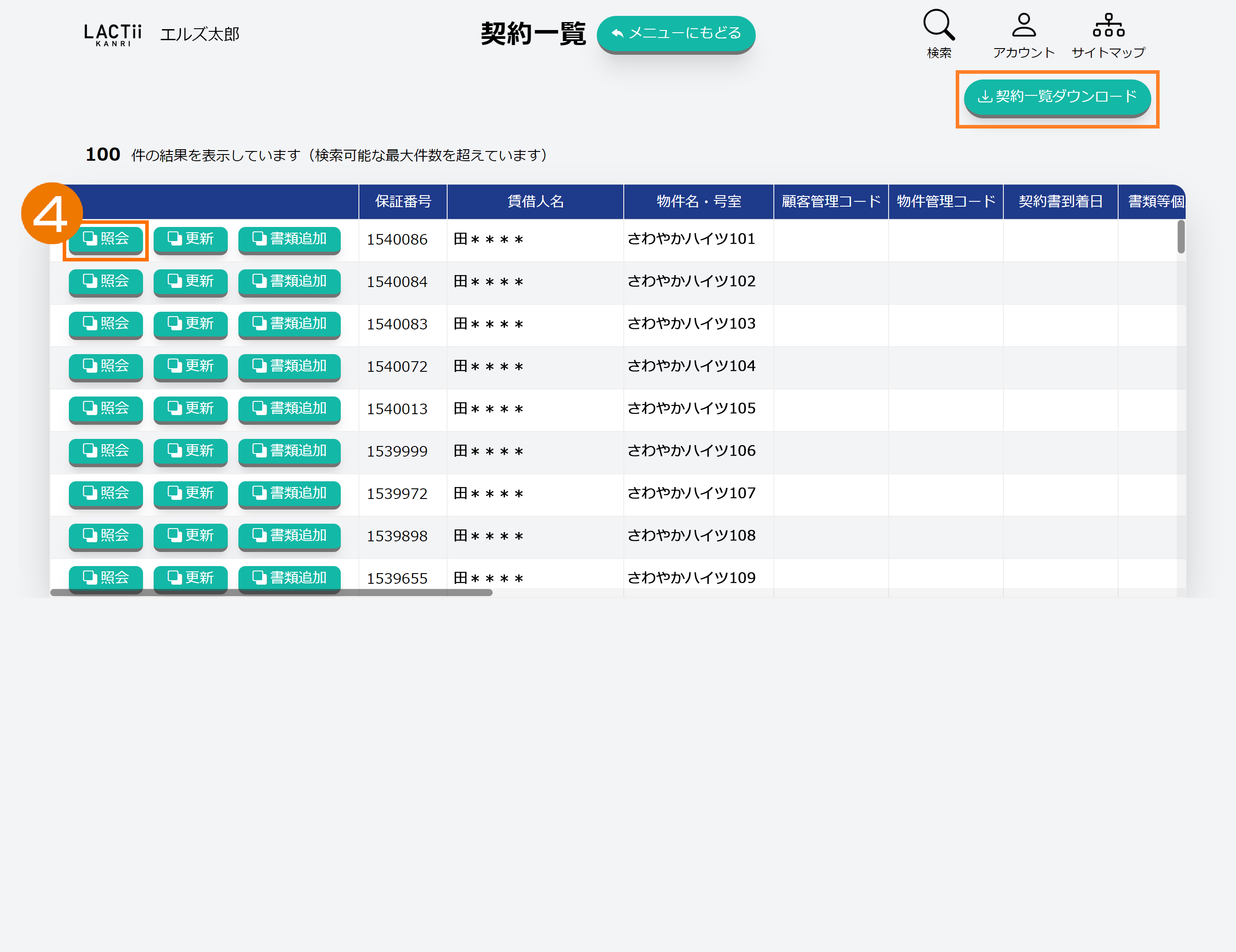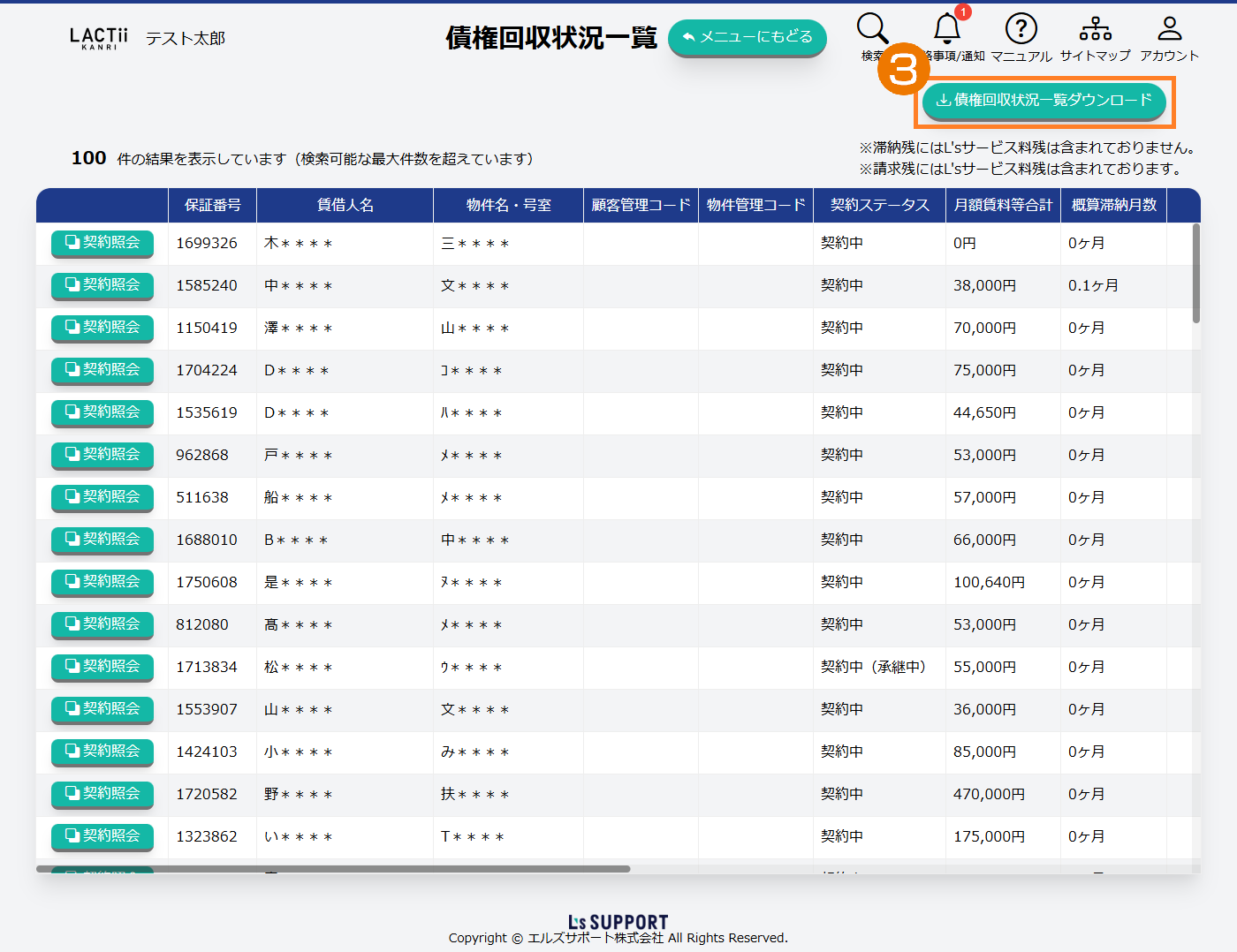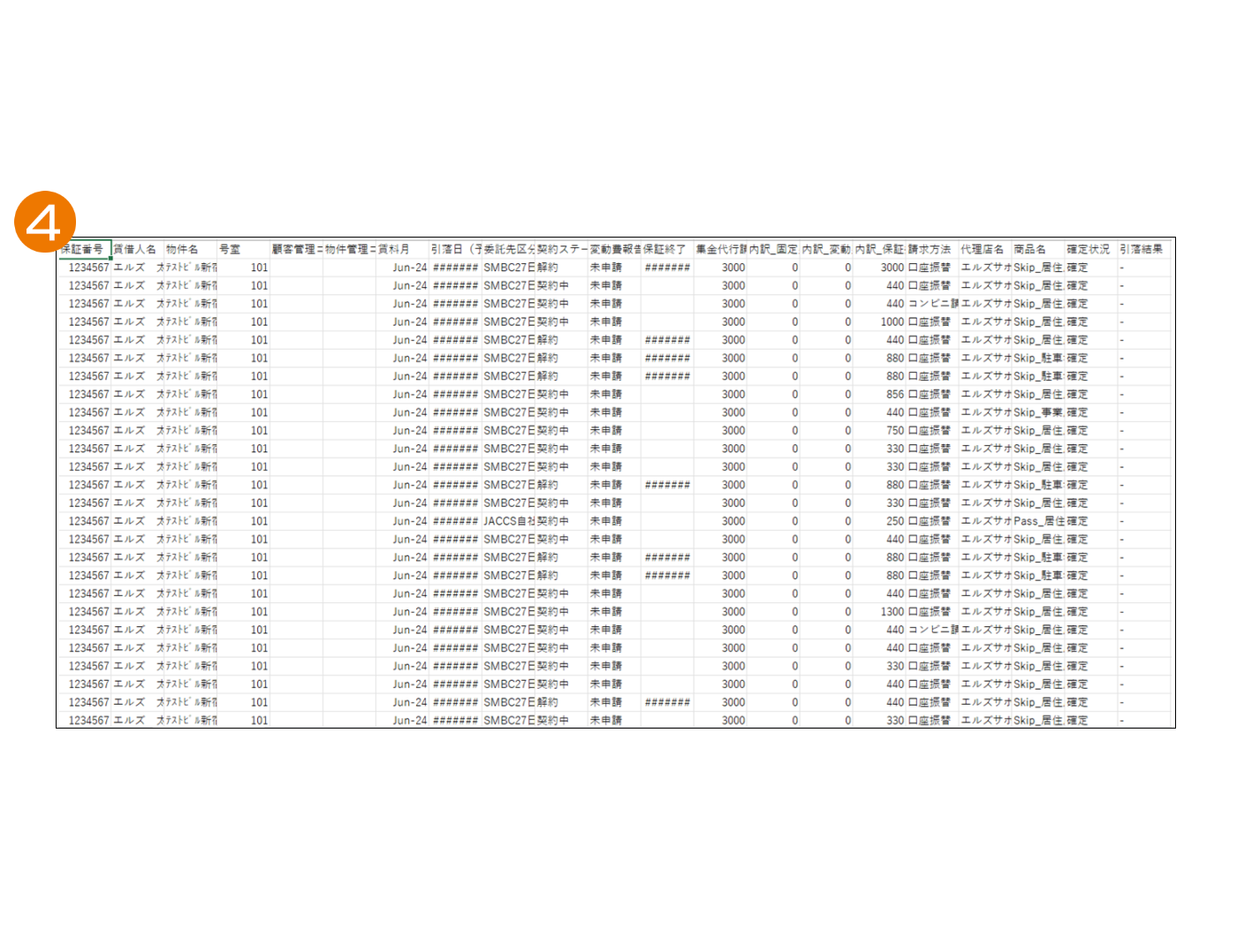 保証番号、賃貸人名、物件名・号室、商品ID、顧客管理コード、物件管理コード、 契約書到着日、書類等個別連絡日、契約ステータス、保証開始日、保証終了(予定)日、 プラン必須指定プラン、集送金開始賃料月、請求残、代理店名