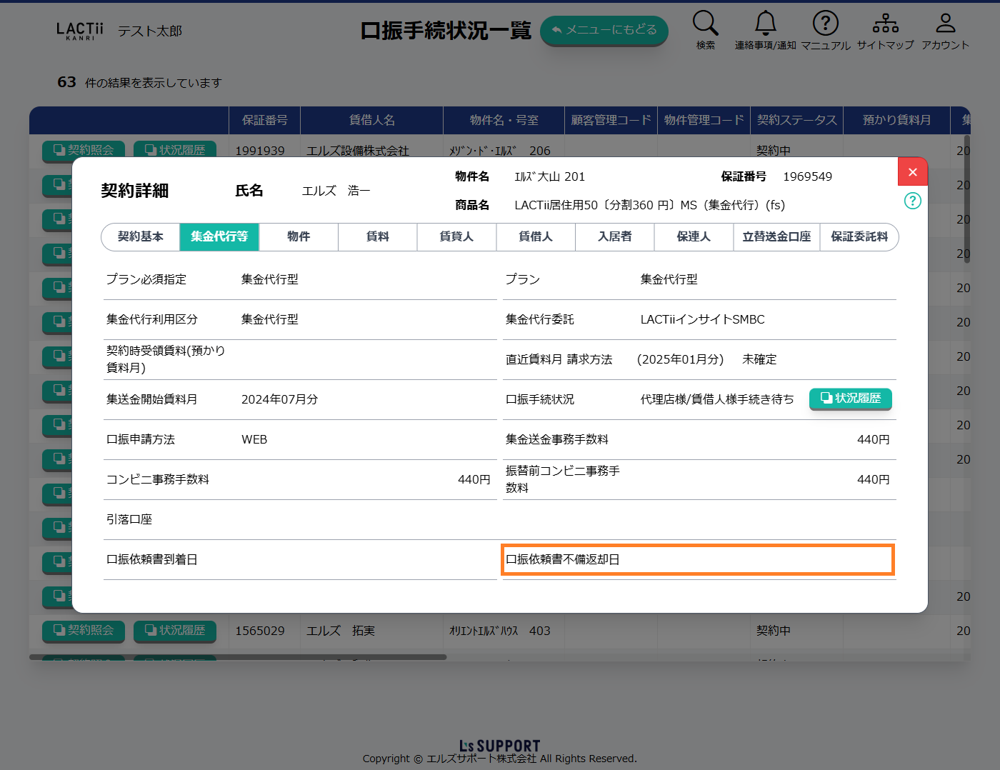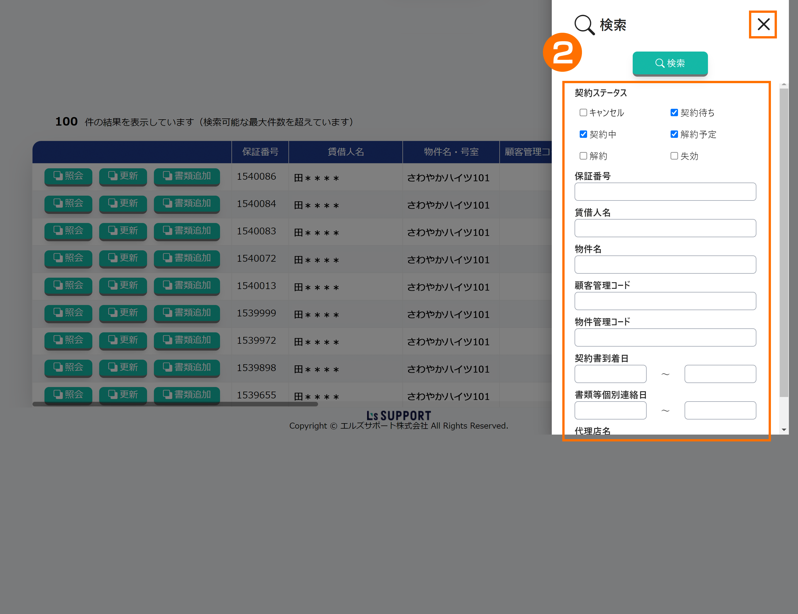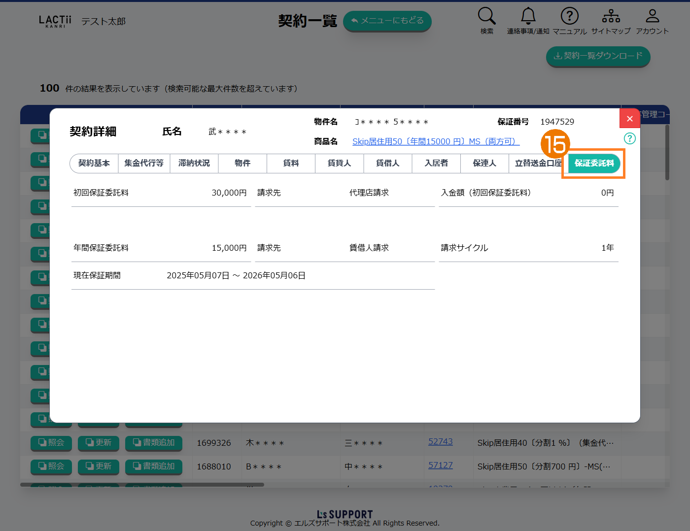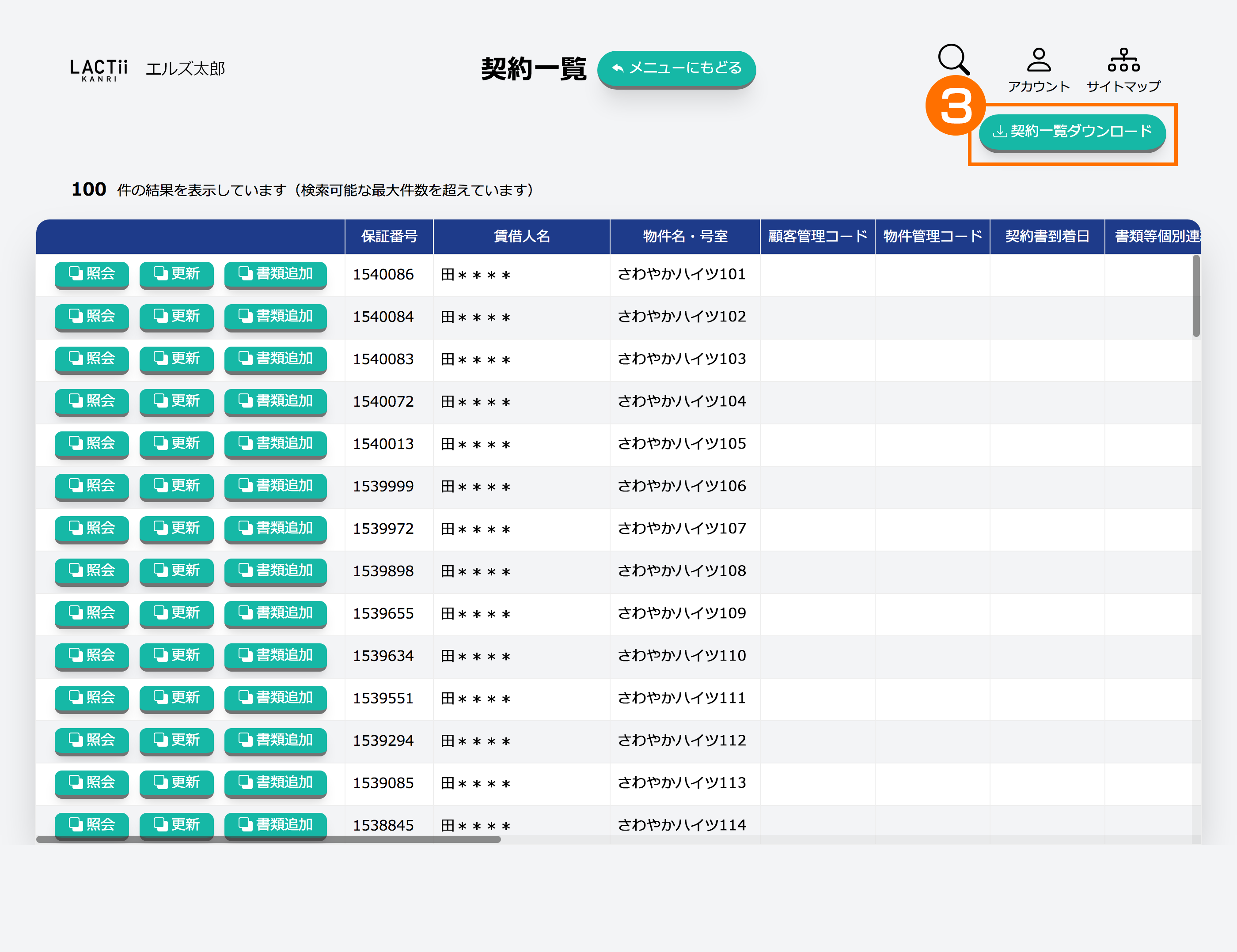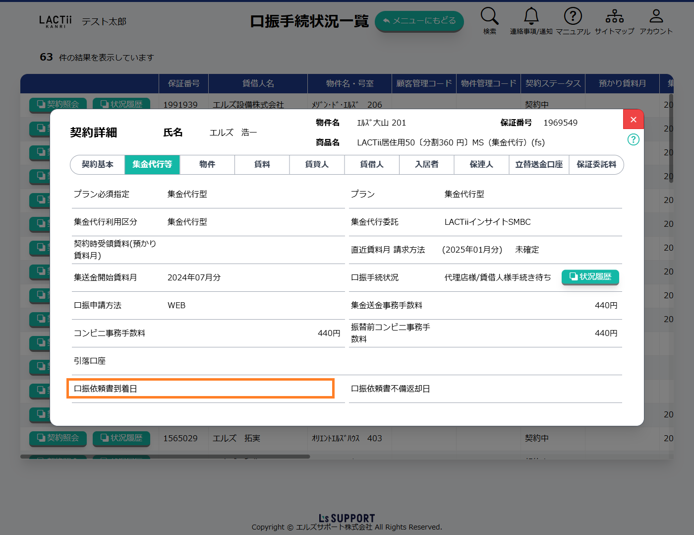 保証番号、賃貸人名、物件名・号室、商品ID、顧客管理コード、物件管理コード、 契約書到着日、書類等個別連絡日、契約ステータス、保証開始日、保証終了(予定)日、 プラン必須指定プラン、集送金開始賃料月、請求残、代理店名