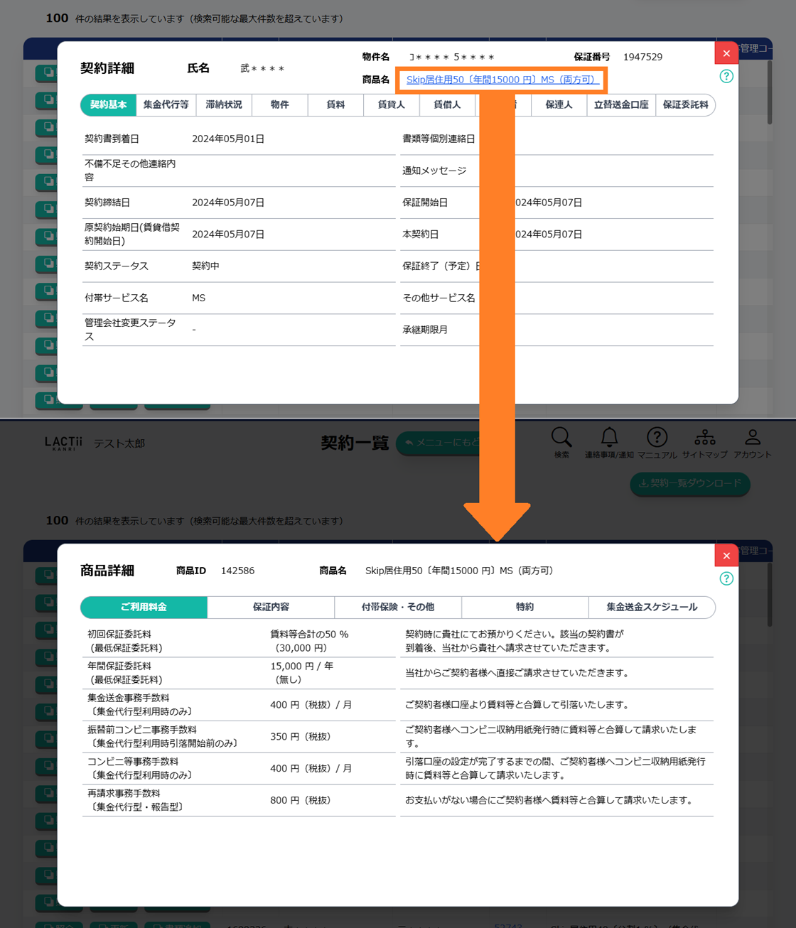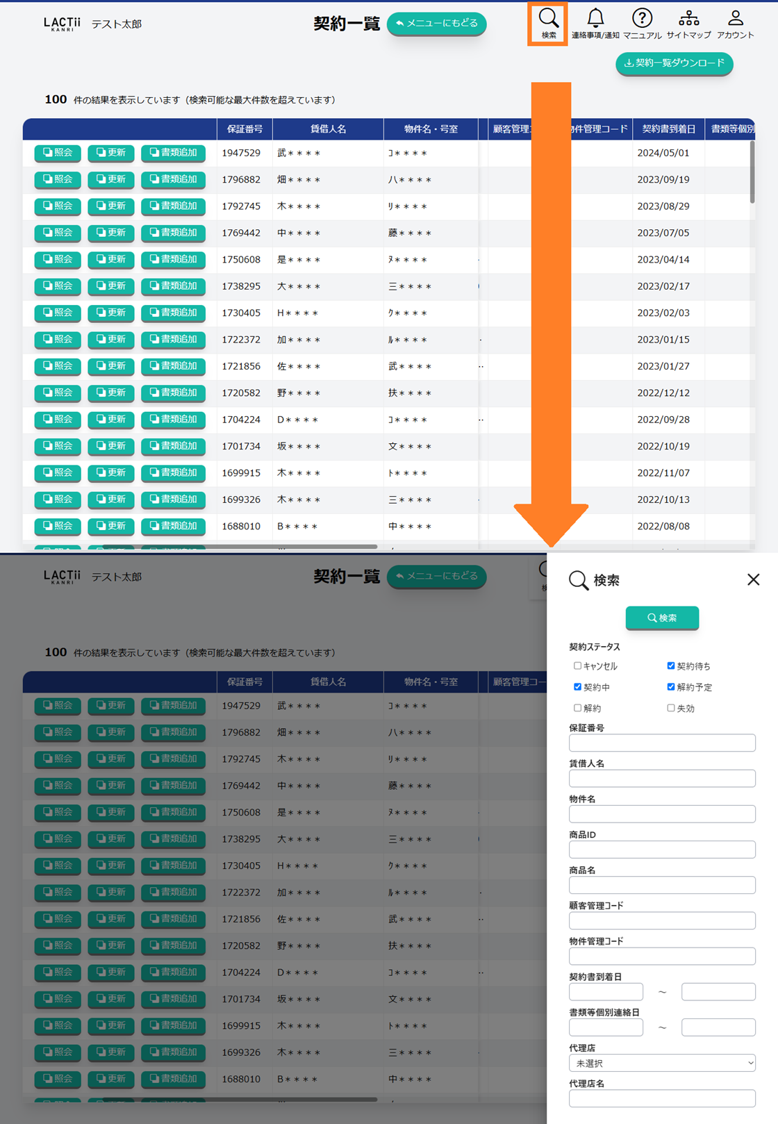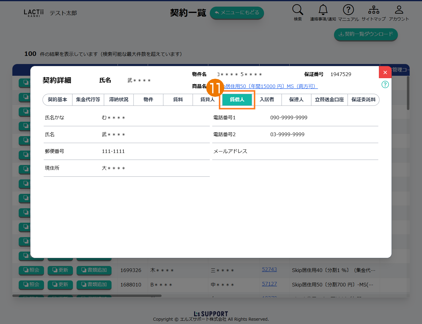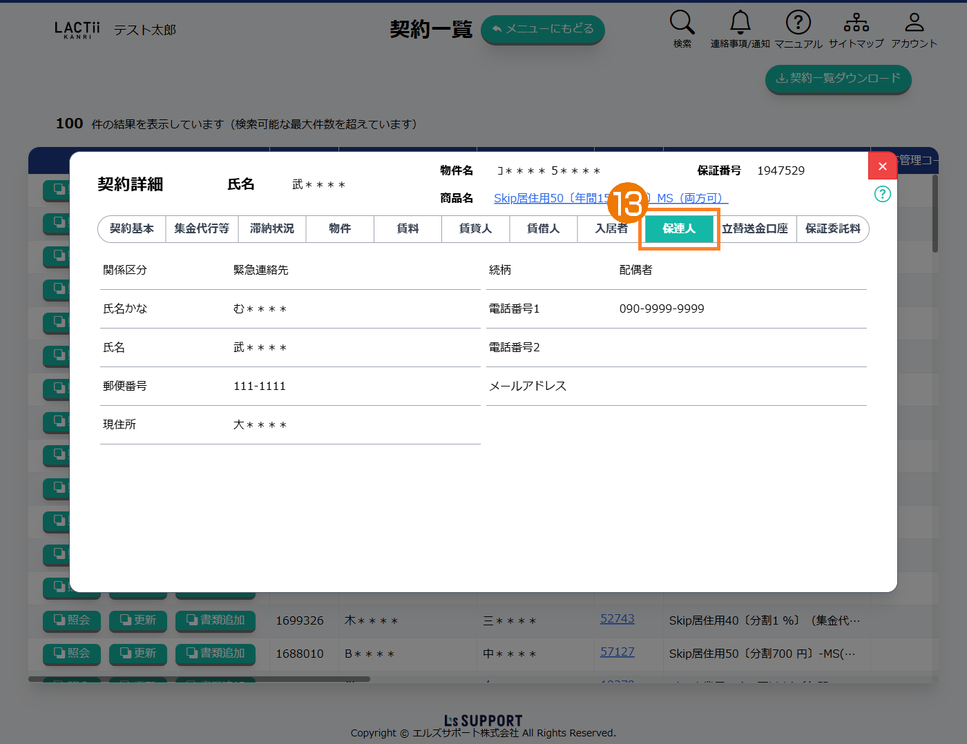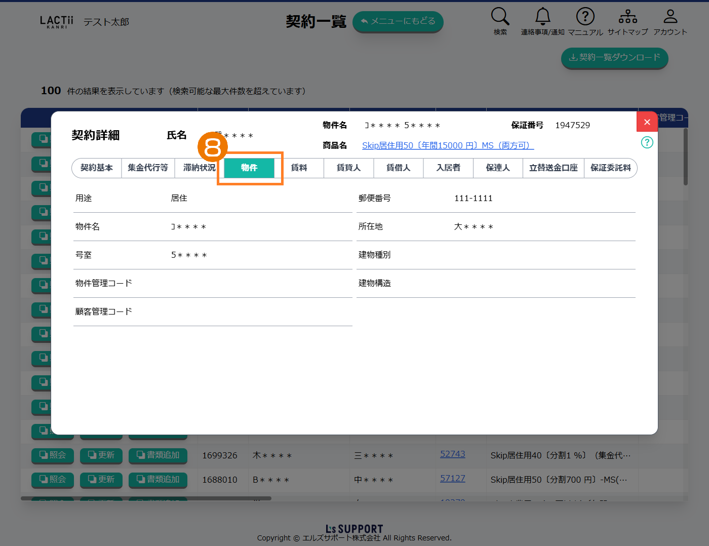 保証番号、賃貸人名、物件名・号室、商品ID、顧客管理コード、物件管理コード、 契約書到着日、書類等個別連絡日、契約ステータス、保証開始日、保証終了(予定)日、 プラン必須指定プラン、集送金開始賃料月、請求残、代理店名