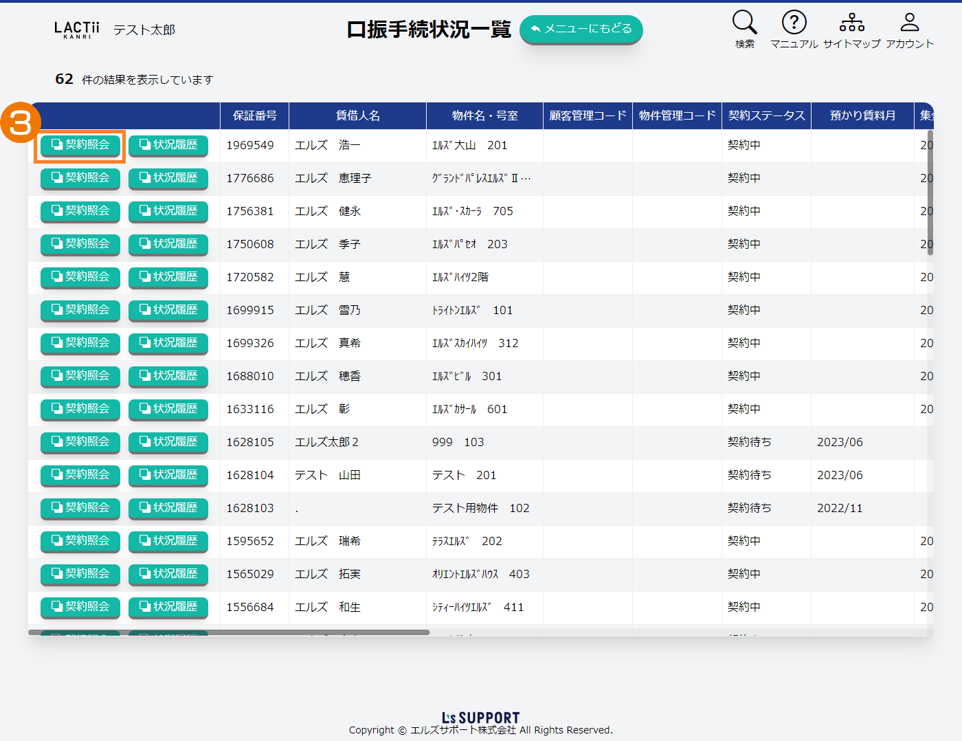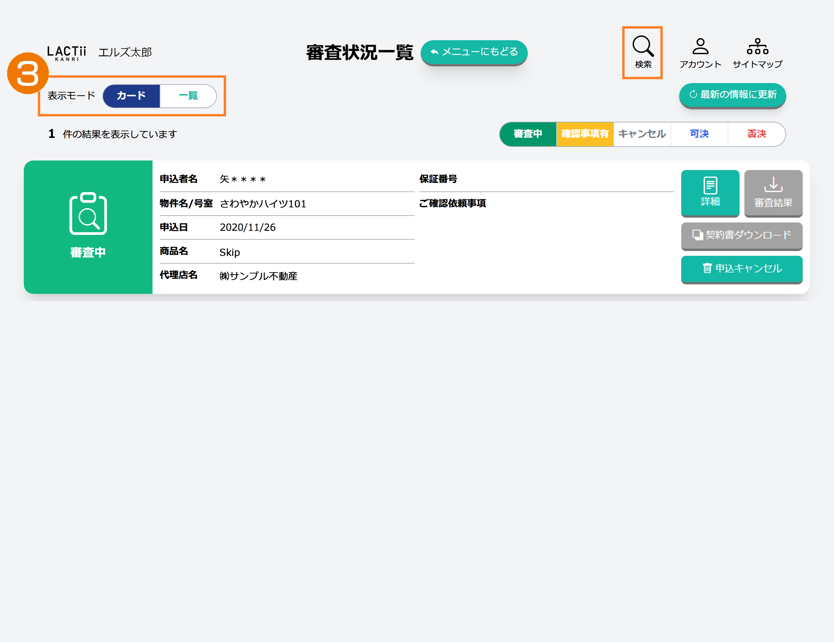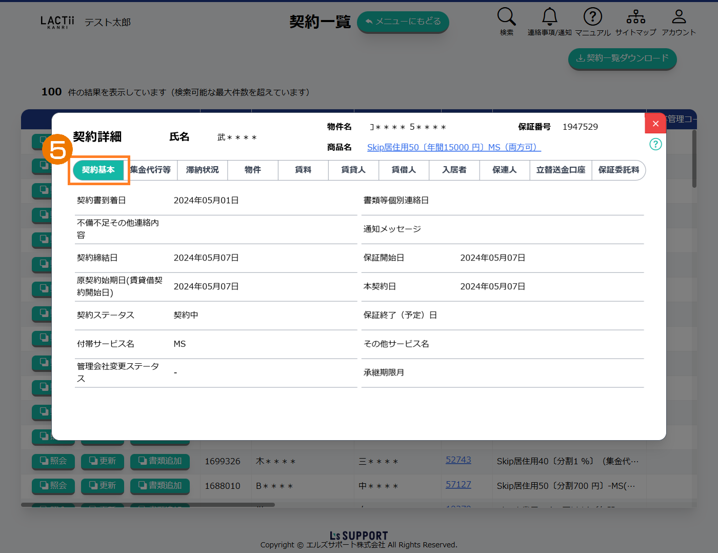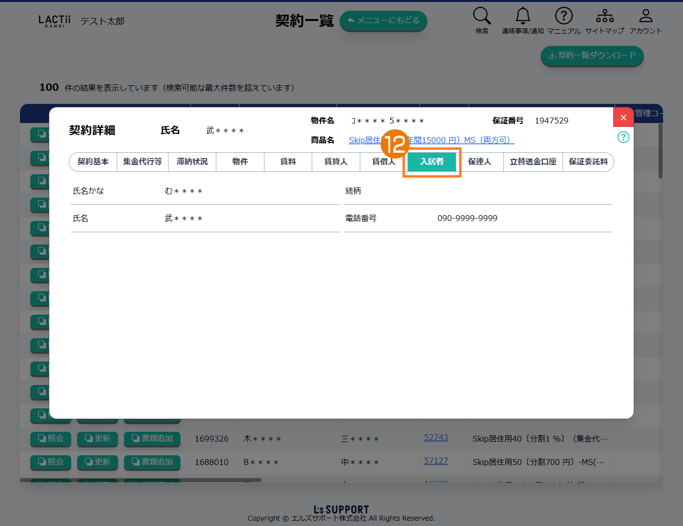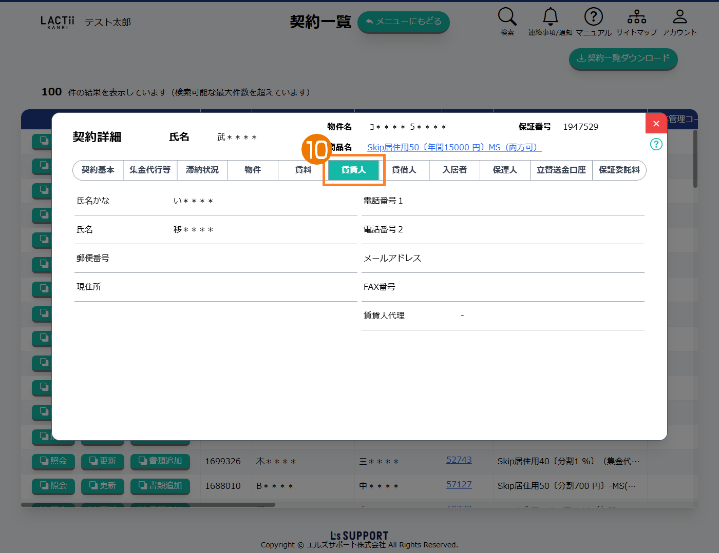 保証番号、賃貸人名、物件名・号室、商品ID、顧客管理コード、物件管理コード、 契約書到着日、書類等個別連絡日、契約ステータス、保証開始日、保証終了(予定)日、 プラン必須指定プラン、集送金開始賃料月、請求残、代理店名