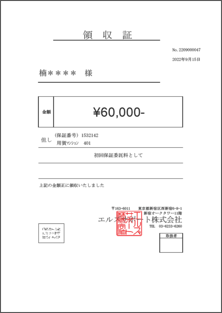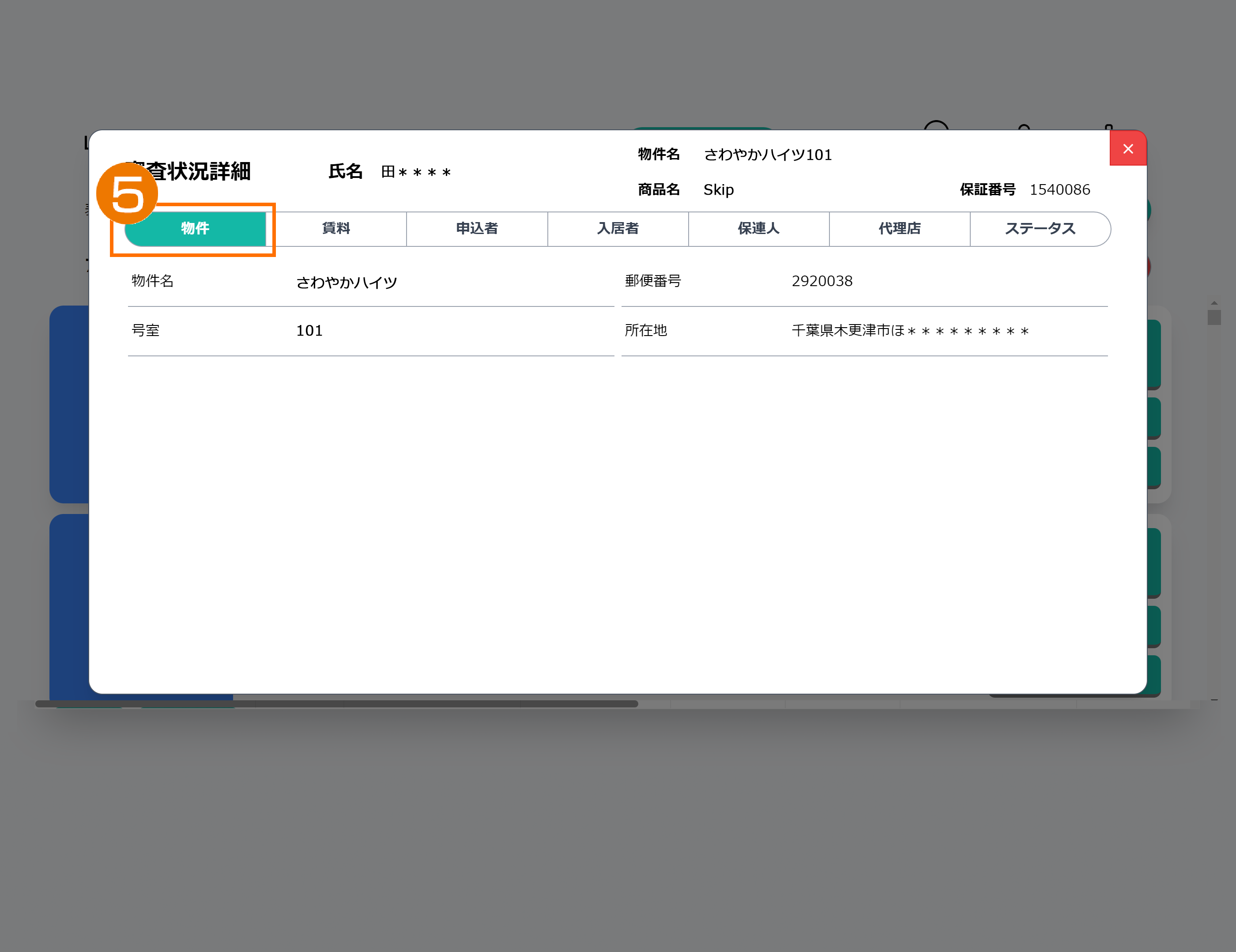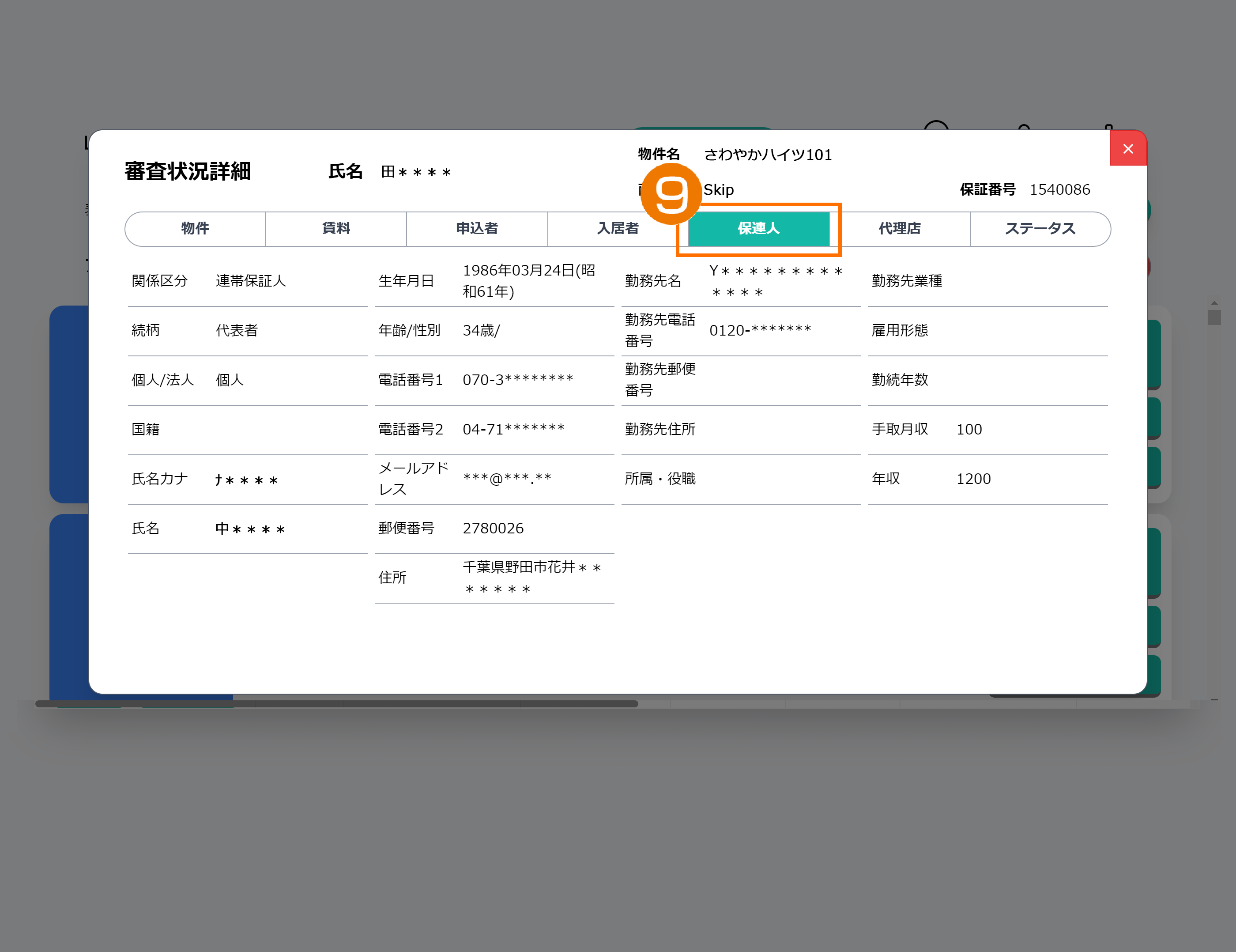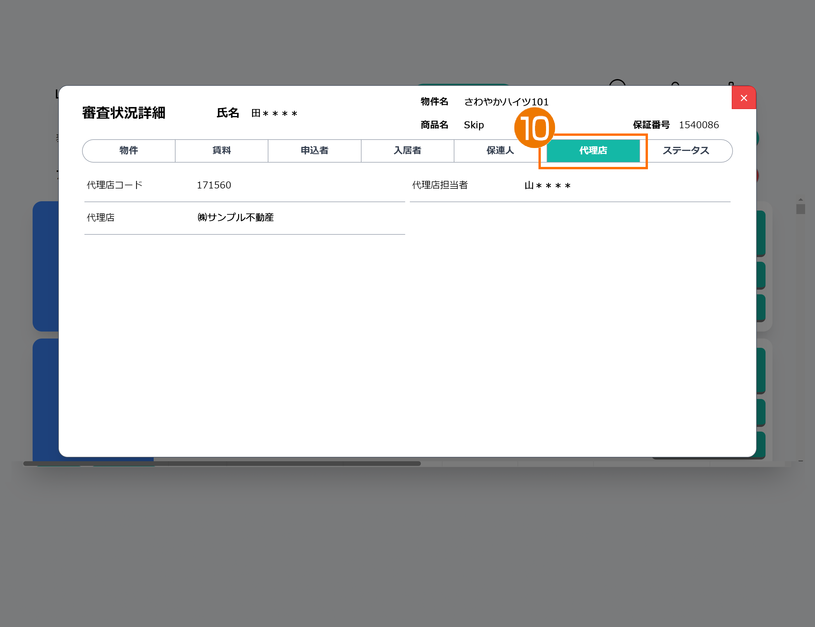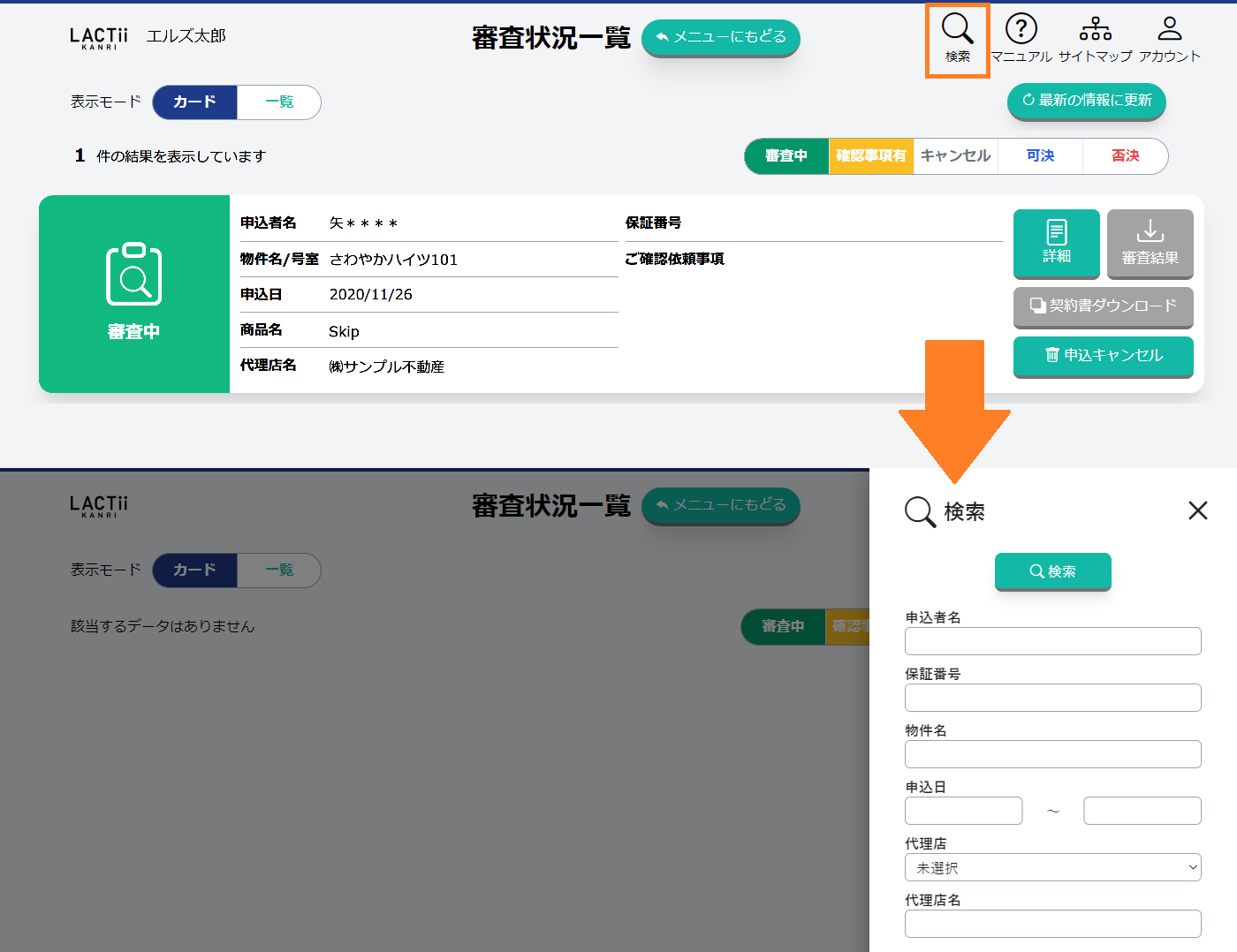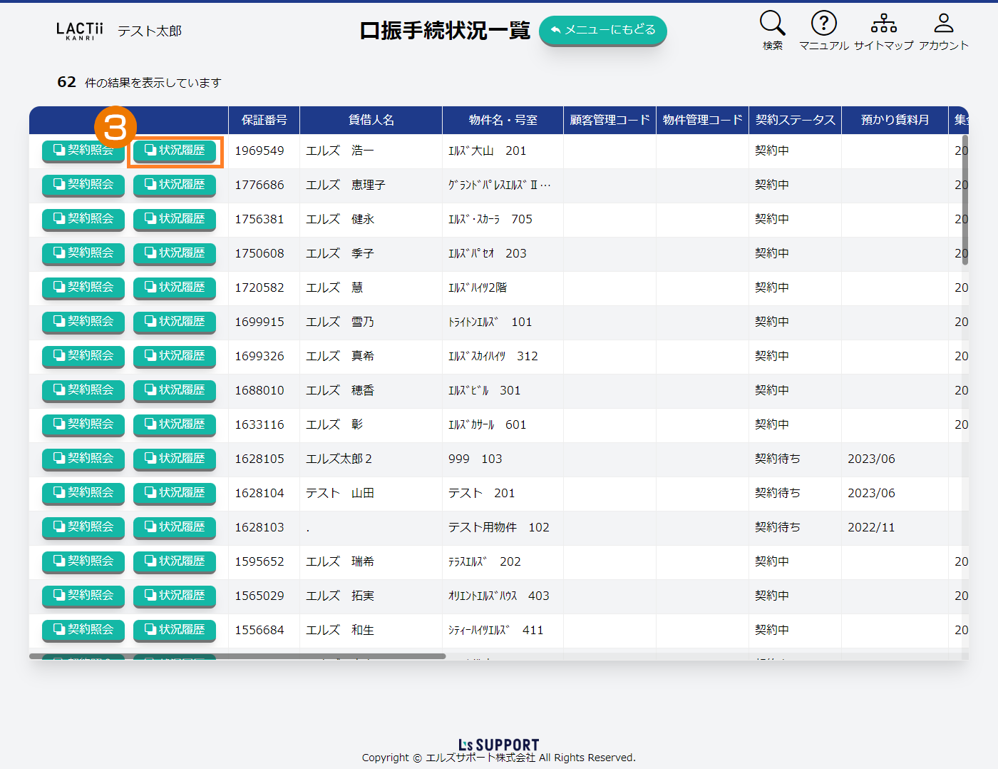 保証番号、賃貸人名、物件名・号室、商品ID、顧客管理コード、物件管理コード、 契約書到着日、書類等個別連絡日、契約ステータス、保証開始日、保証終了(予定)日、 プラン必須指定プラン、集送金開始賃料月、請求残、代理店名