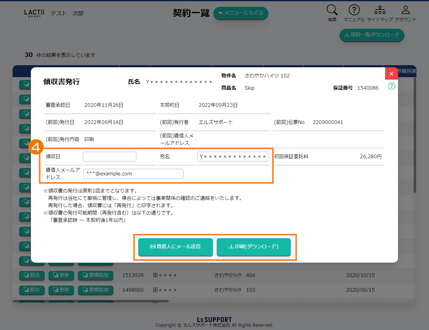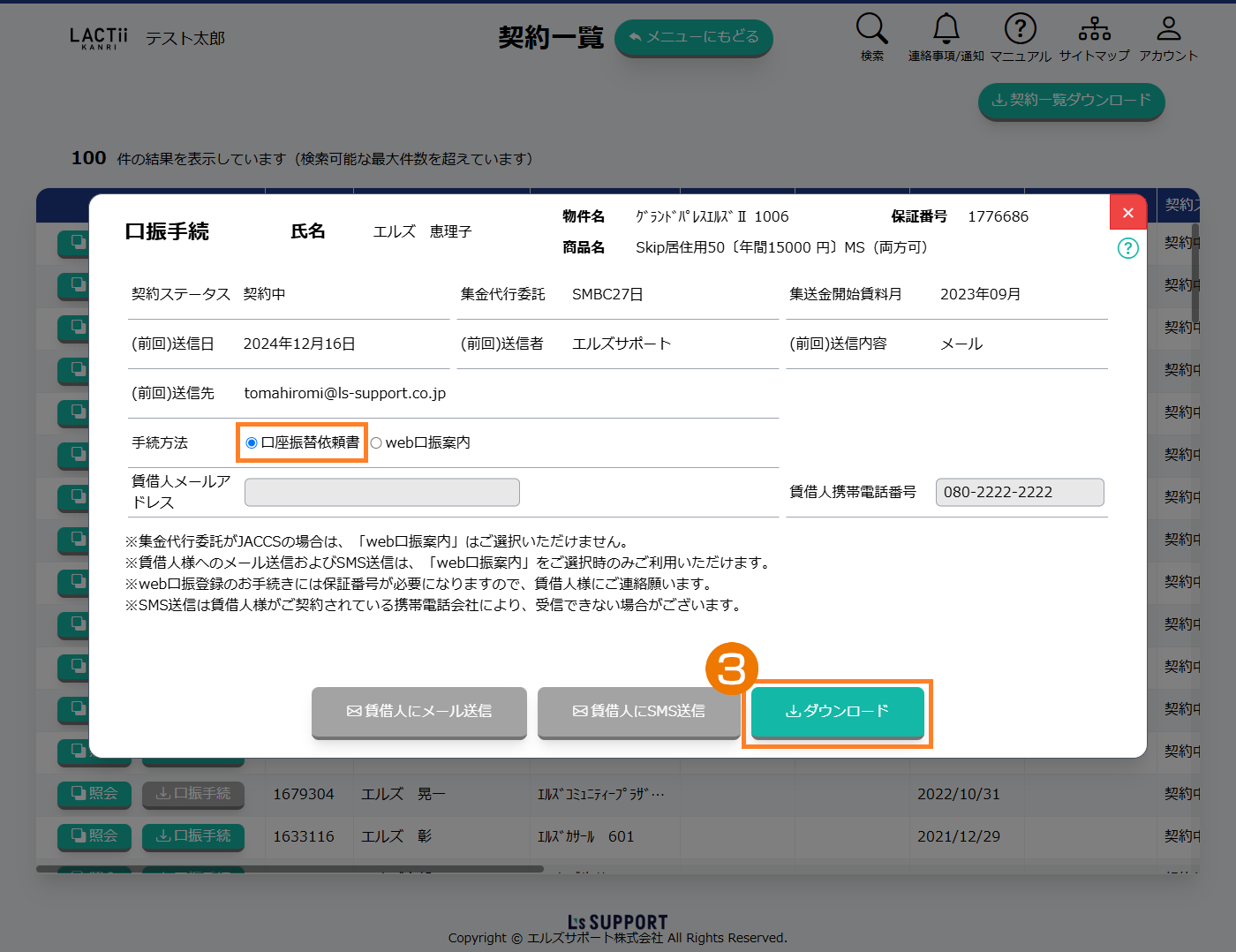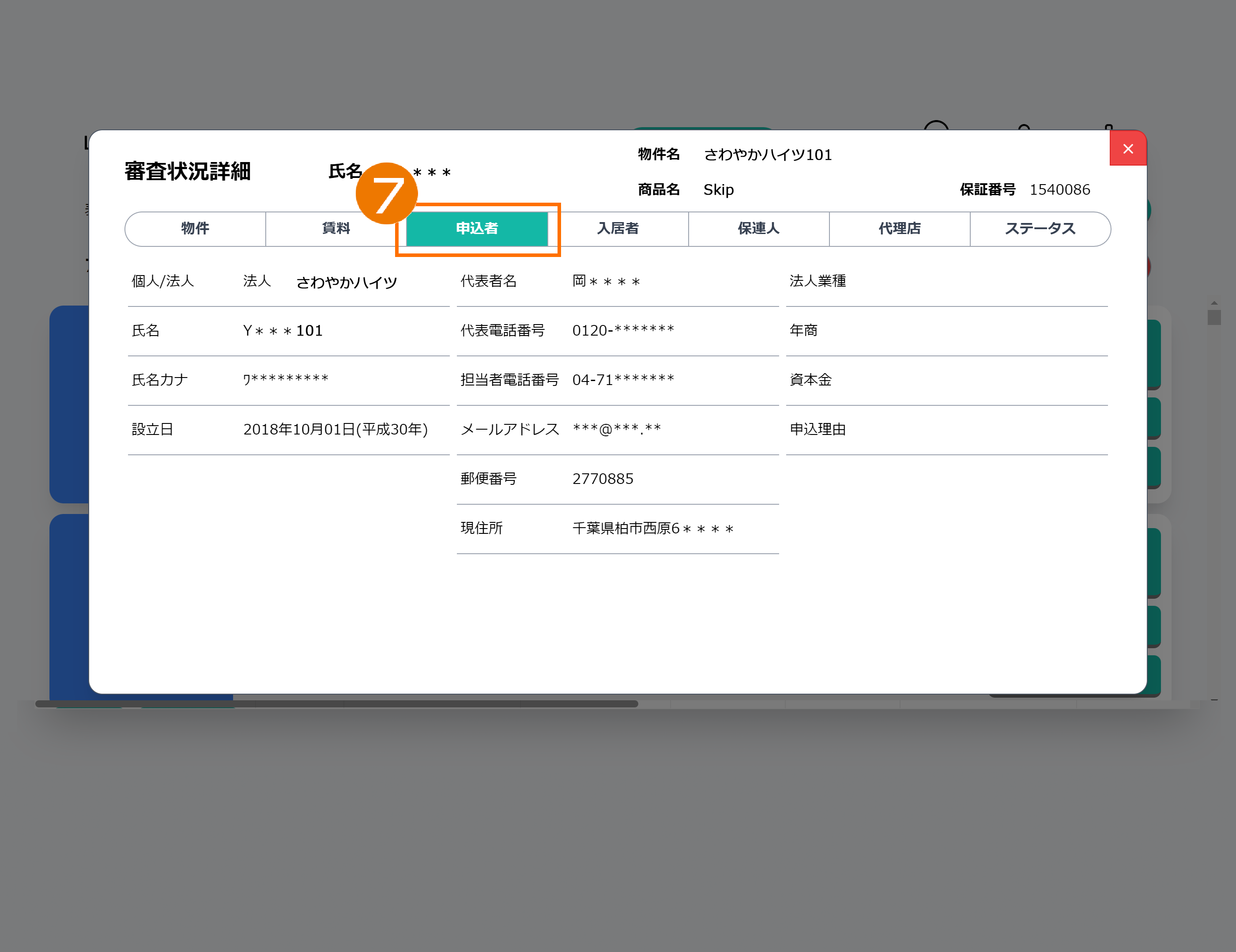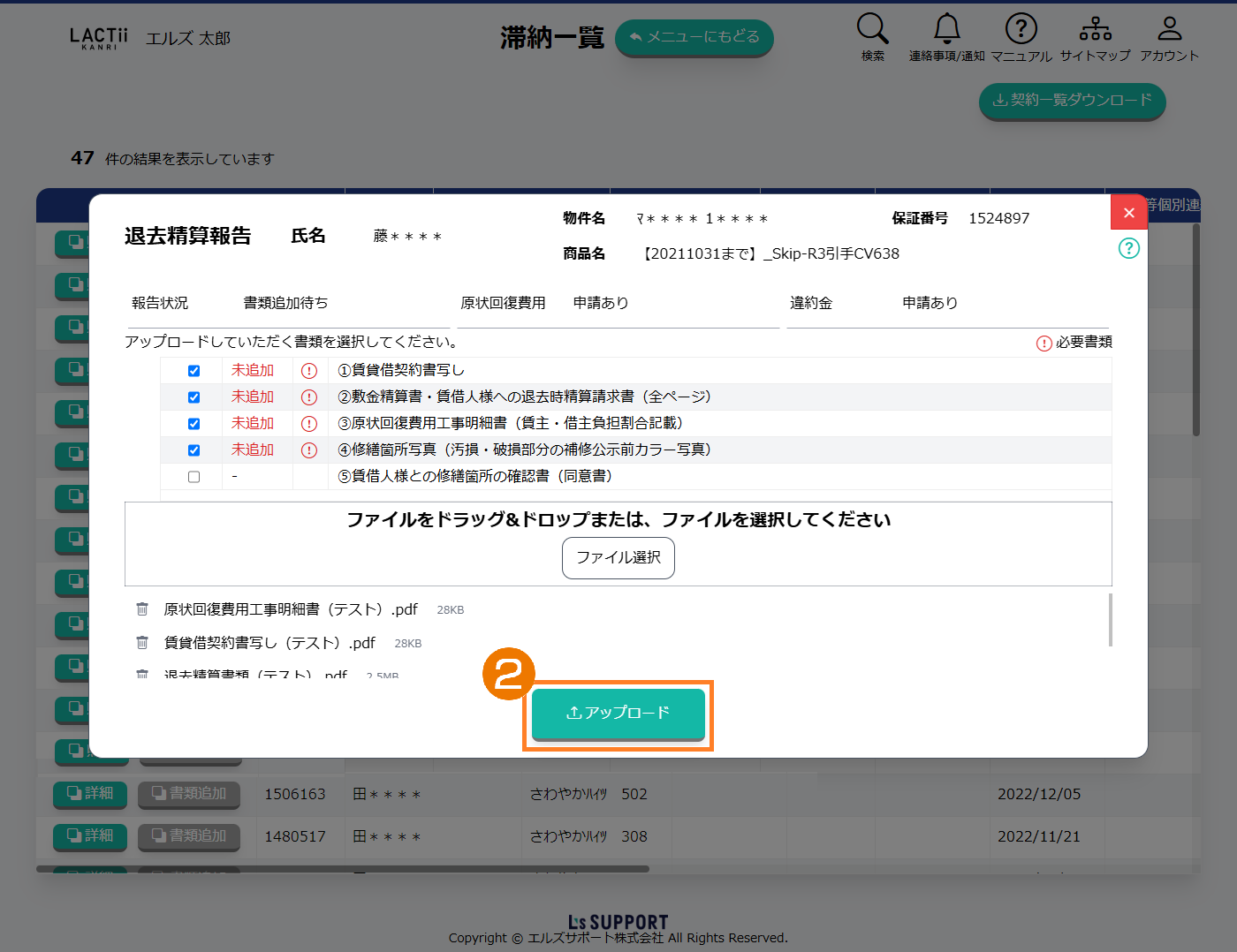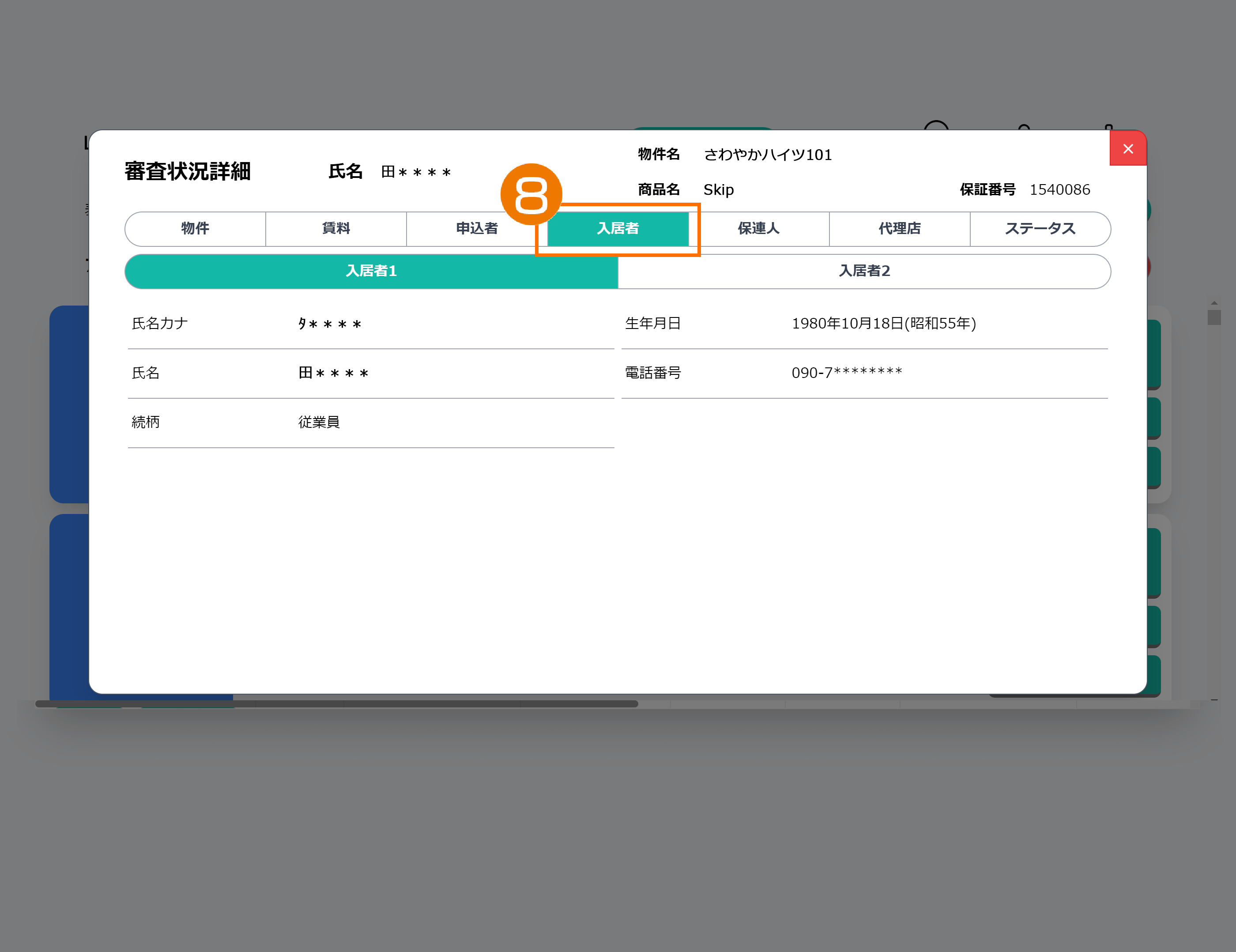保証番号、賃貸人名、物件名・号室、商品ID、顧客管理コード、物件管理コード、 契約書到着日、書類等個別連絡日、契約ステータス、保証開始日、保証終了(予定)日、 プラン必須指定プラン、集送金開始賃料月、請求残、代理店名