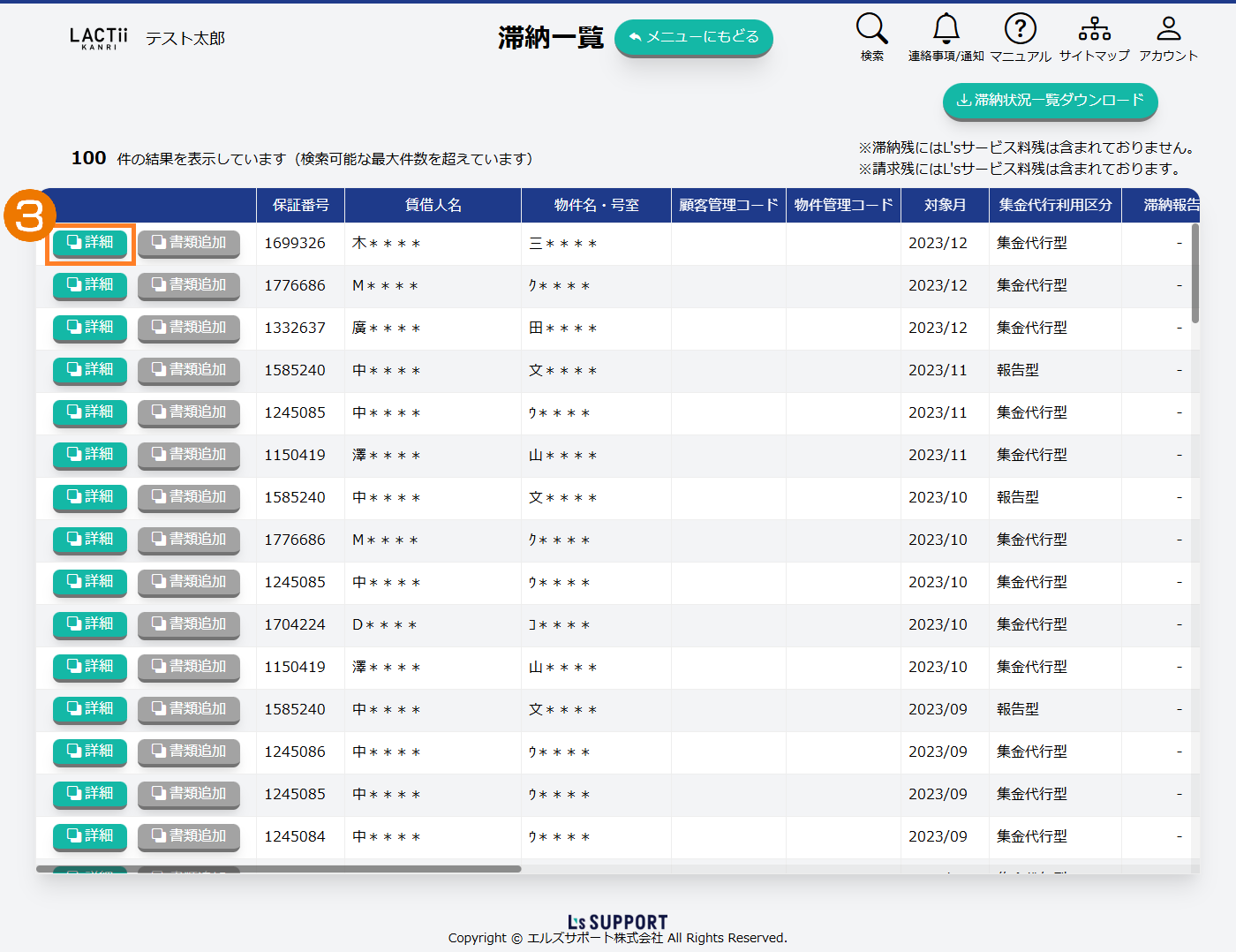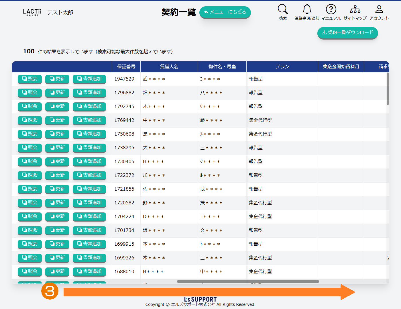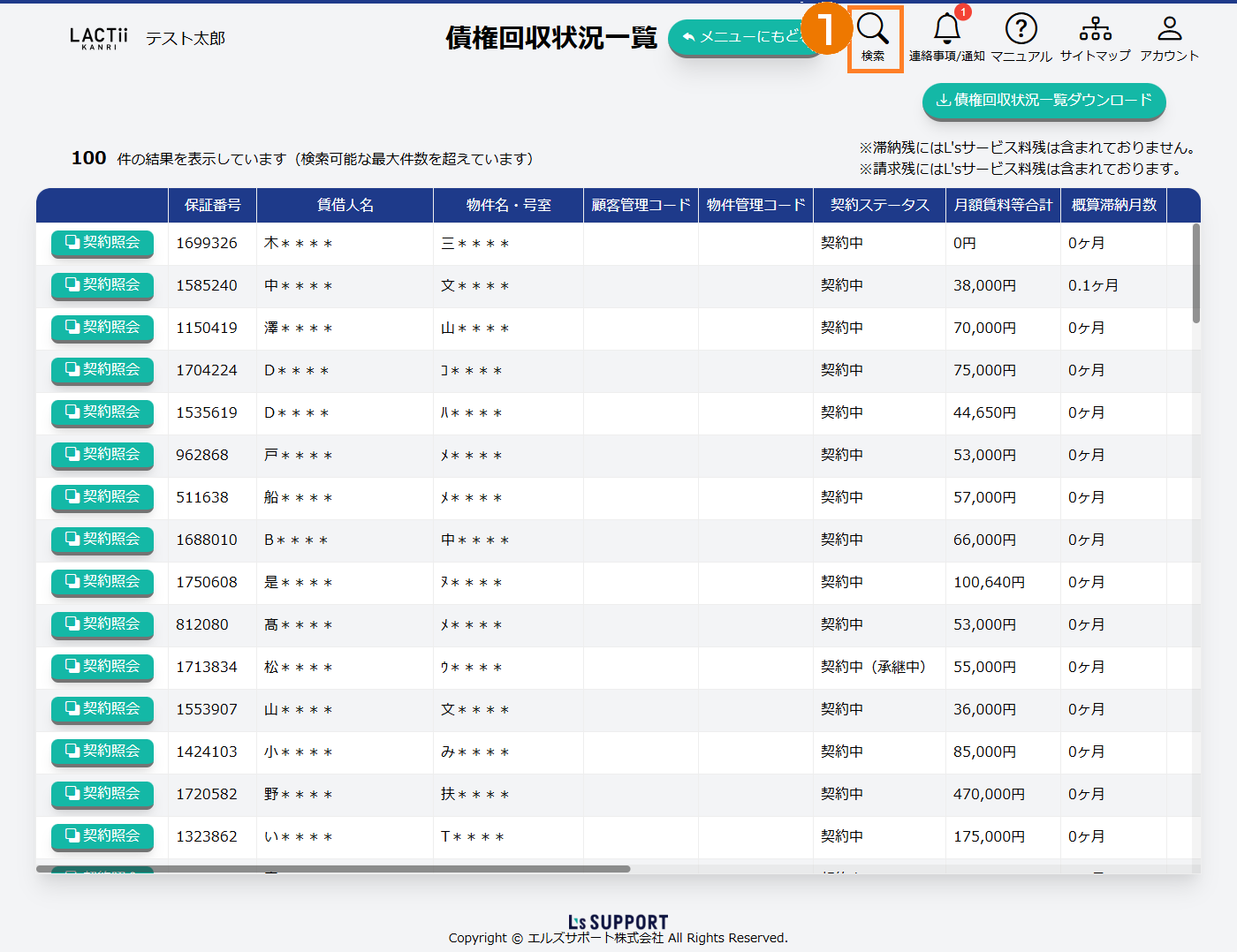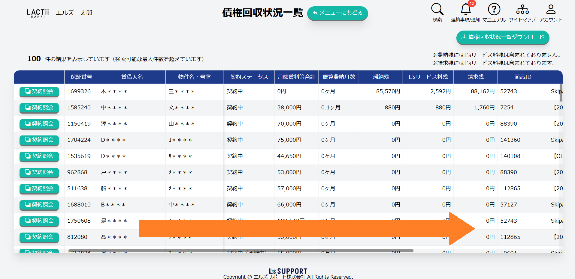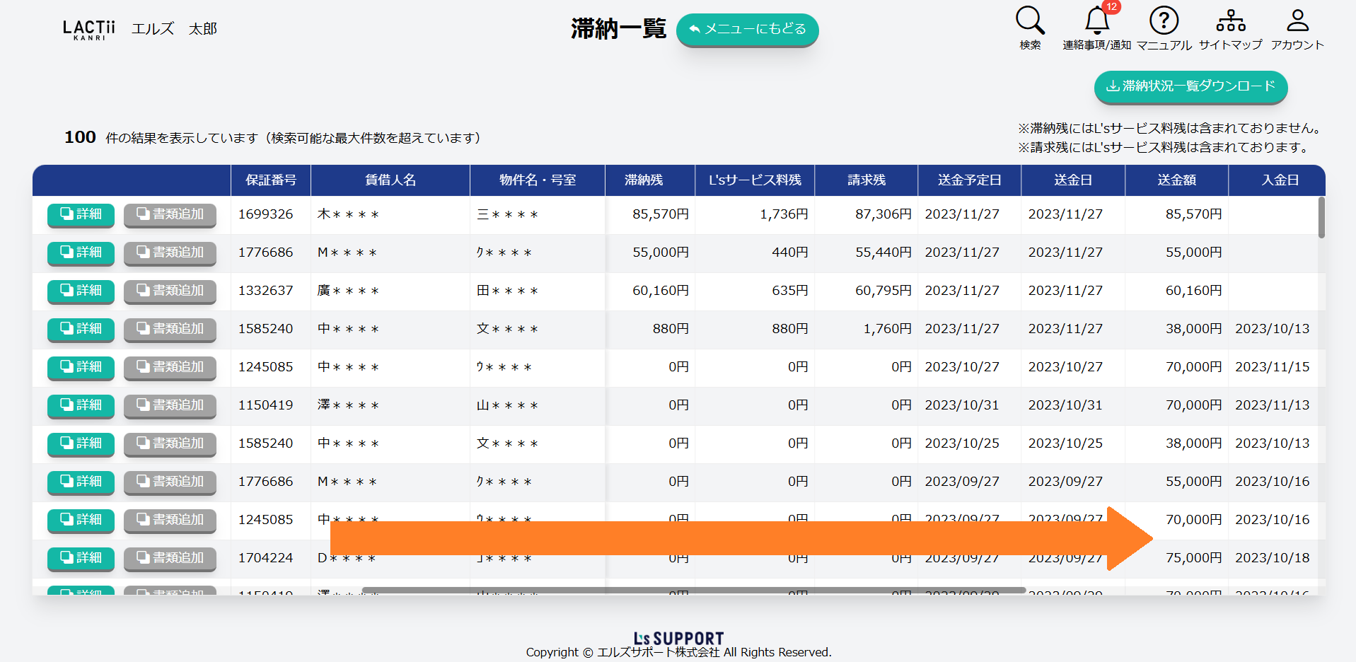 一覧画面で右にスクロールすることで月額賃料等合計、概算滞納月数、滞納残、L’sサービス料残、請求残、商品ID、商品名、集金代行利用区分、代理店名をご確認いただくことができます。