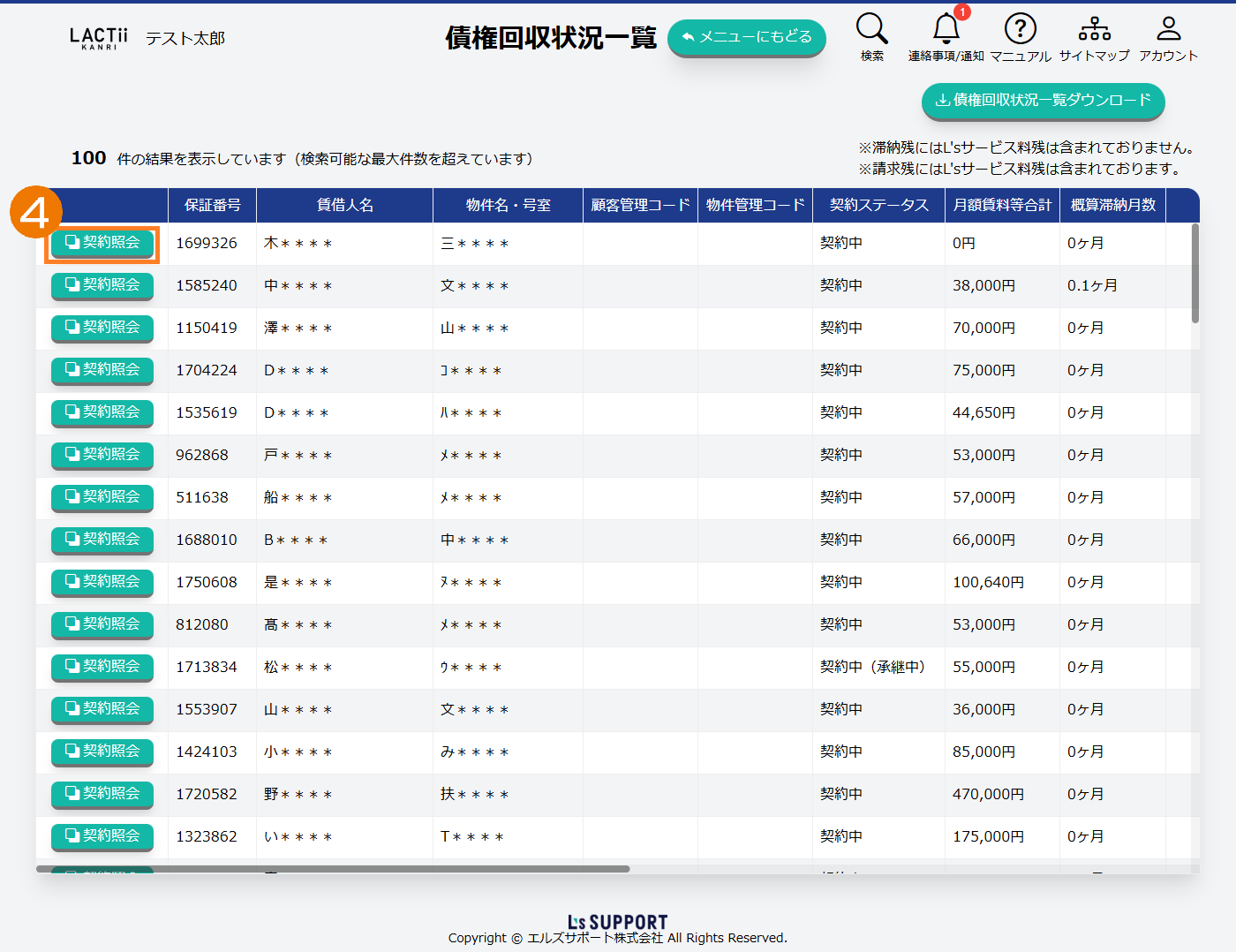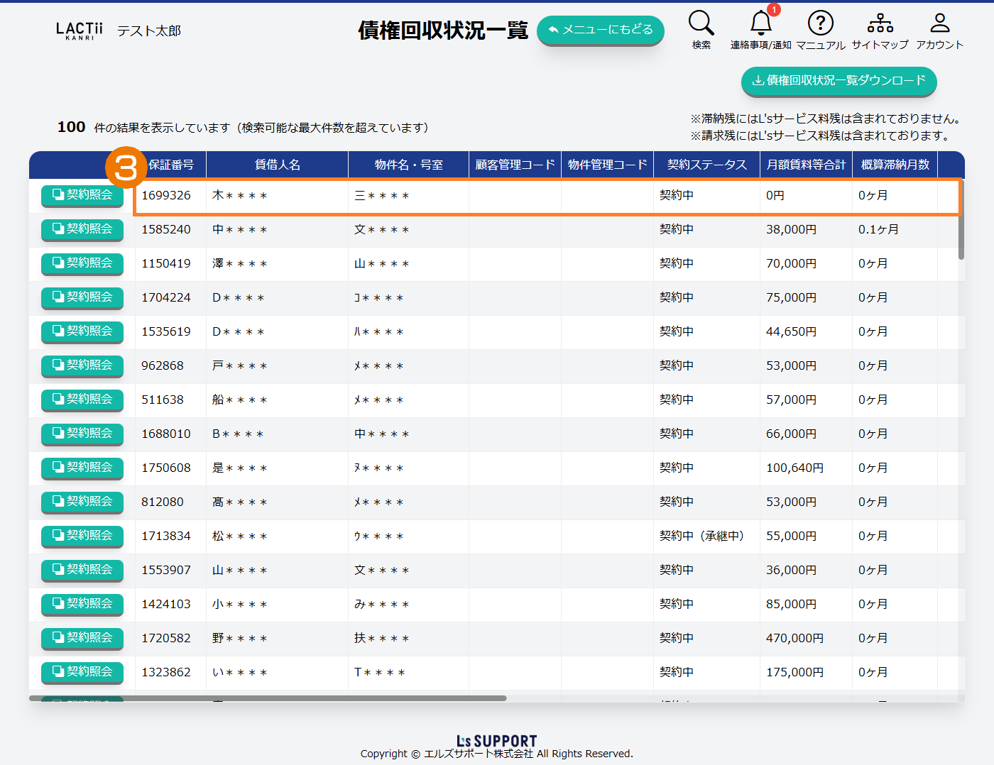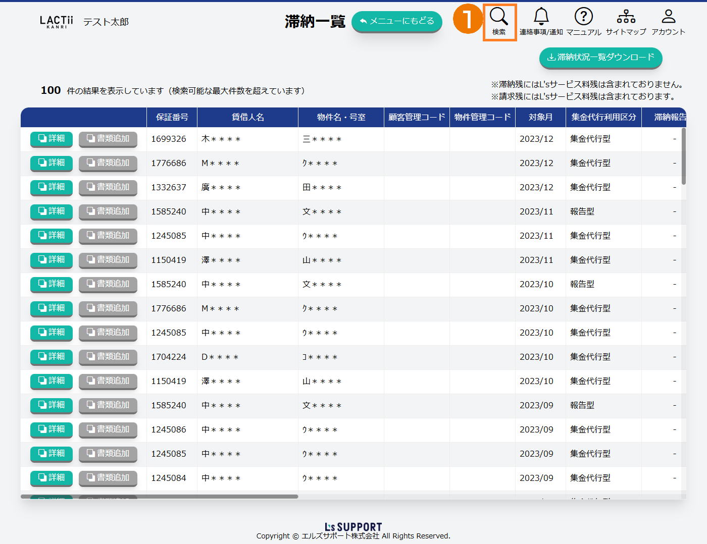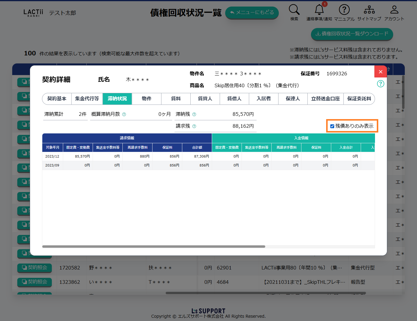 一覧画面で右にスクロールすることで月額賃料等合計、概算滞納月数、滞納残、L’sサービス料残、請求残、商品ID、商品名、集金代行利用区分、代理店名をご確認いただくことができます。