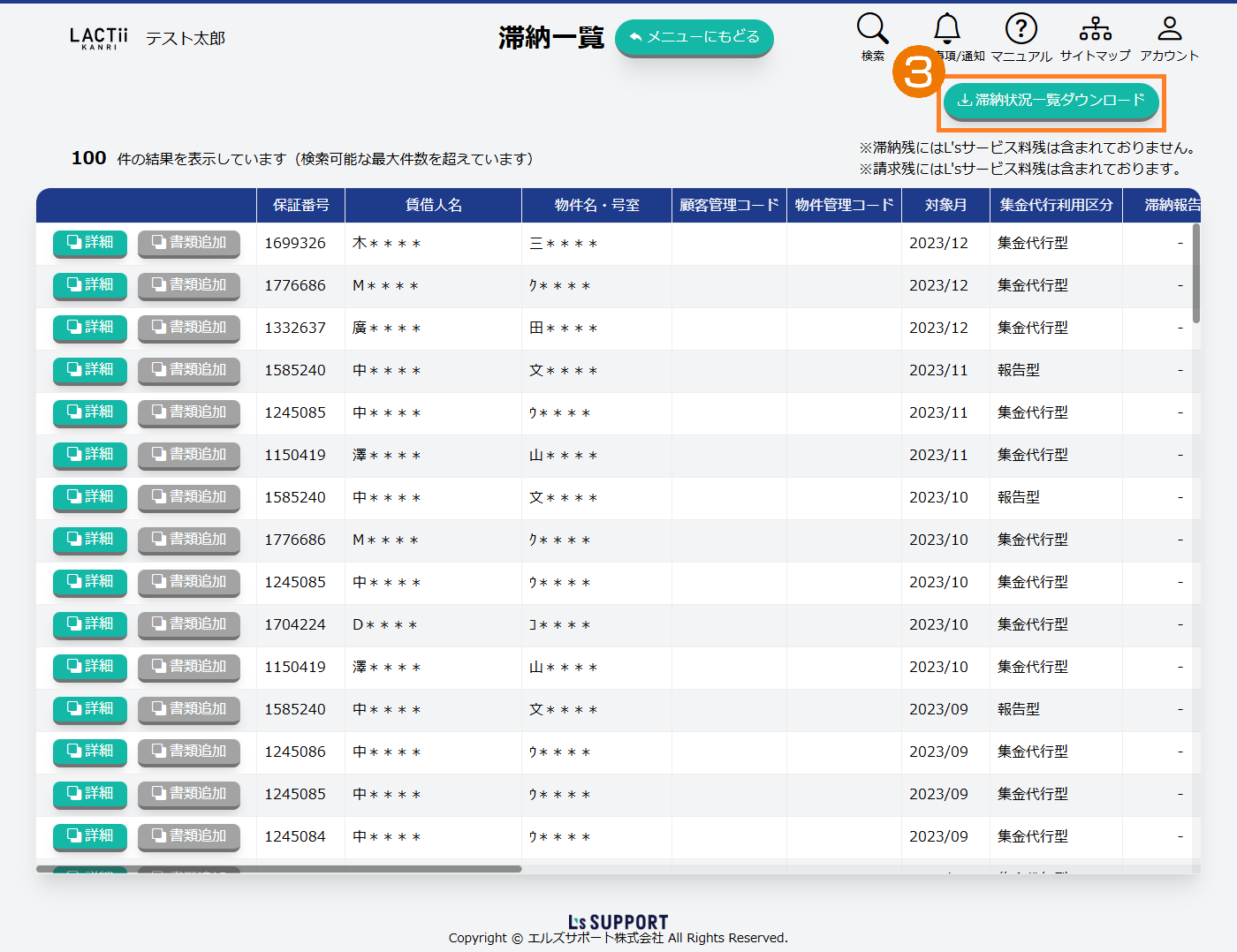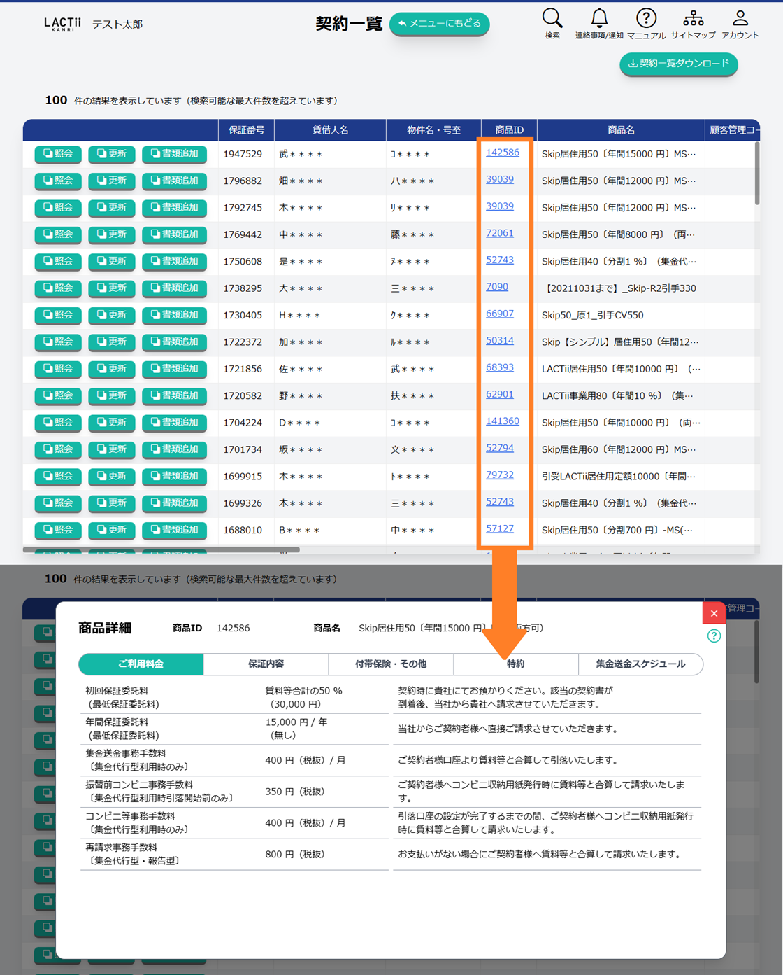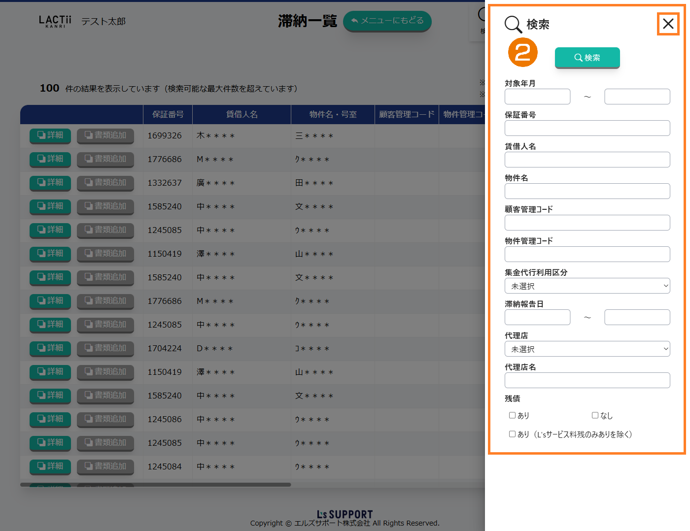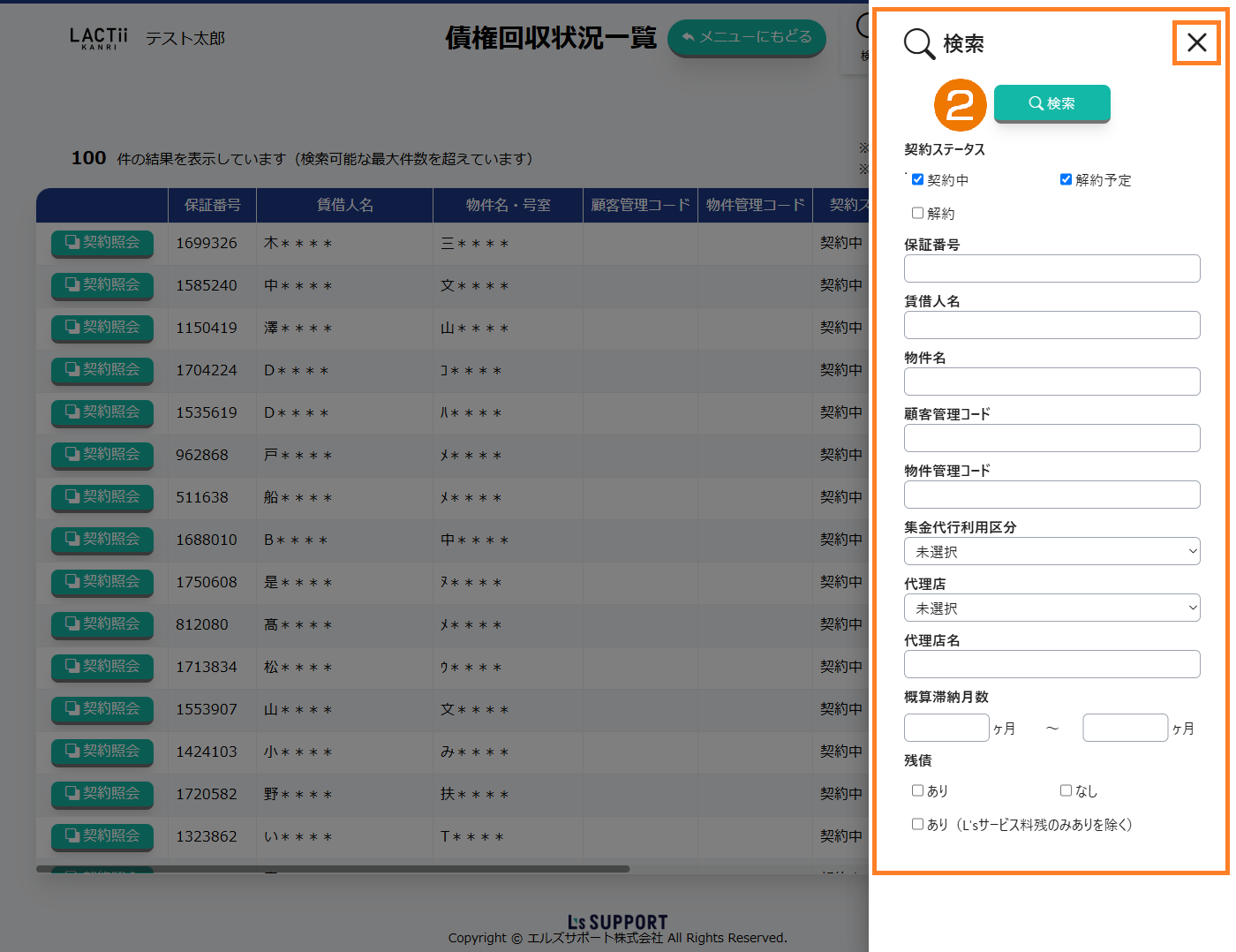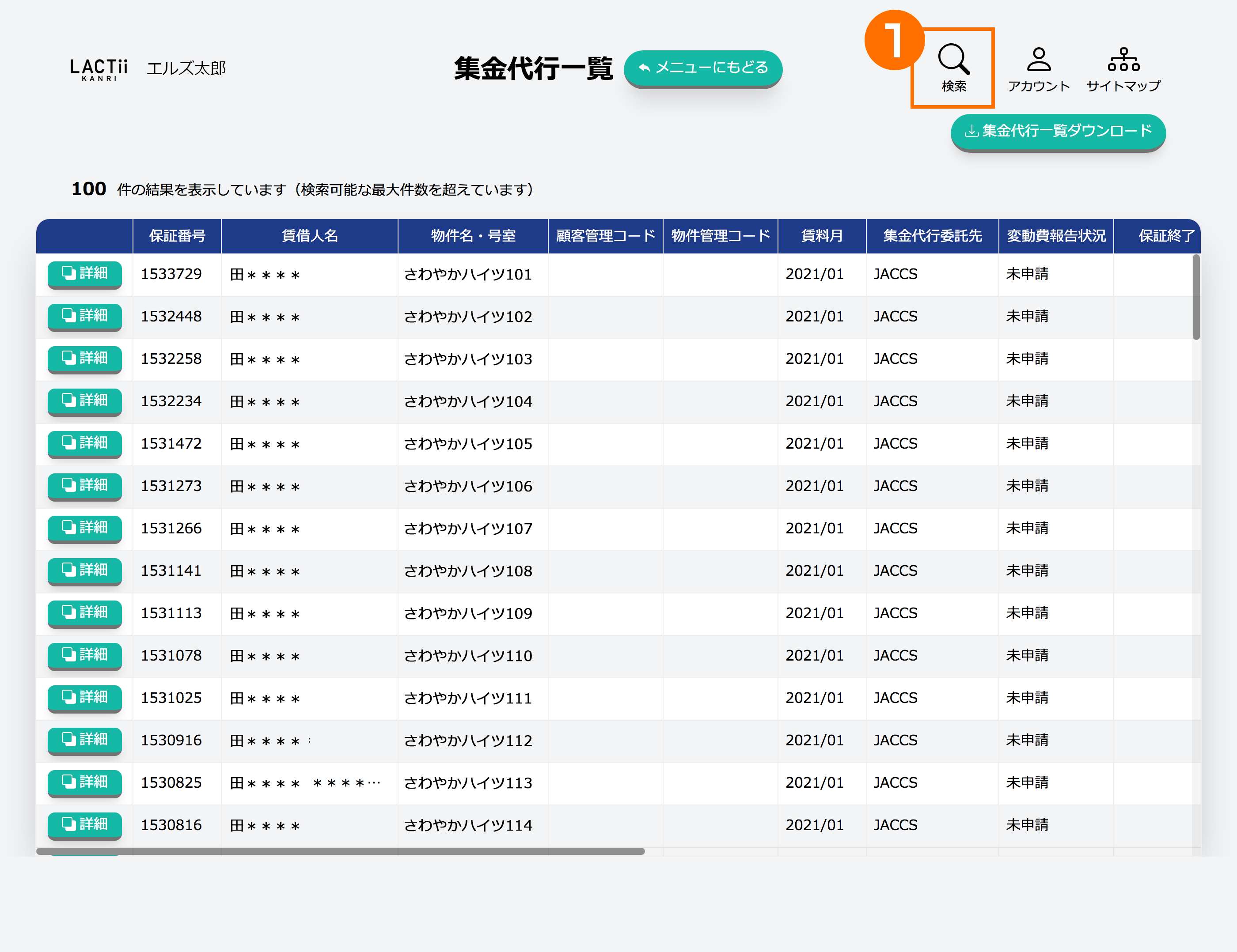 一覧画面で右にスクロールすることで月額賃料等合計、概算滞納月数、滞納残、L’sサービス料残、請求残、商品ID、商品名、集金代行利用区分、代理店名をご確認いただくことができます。