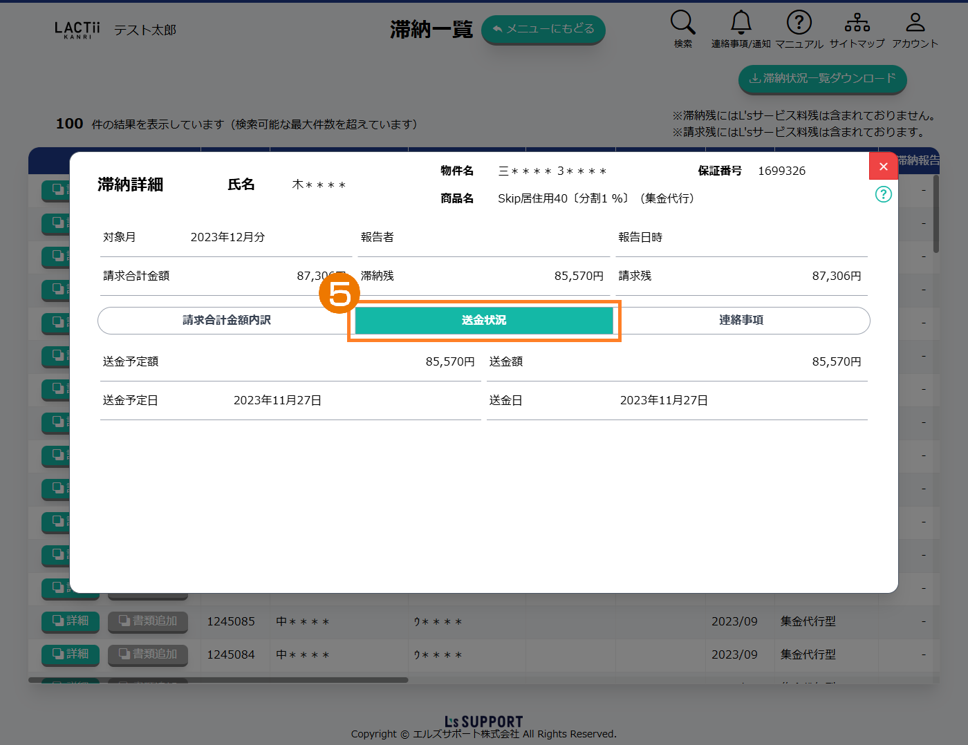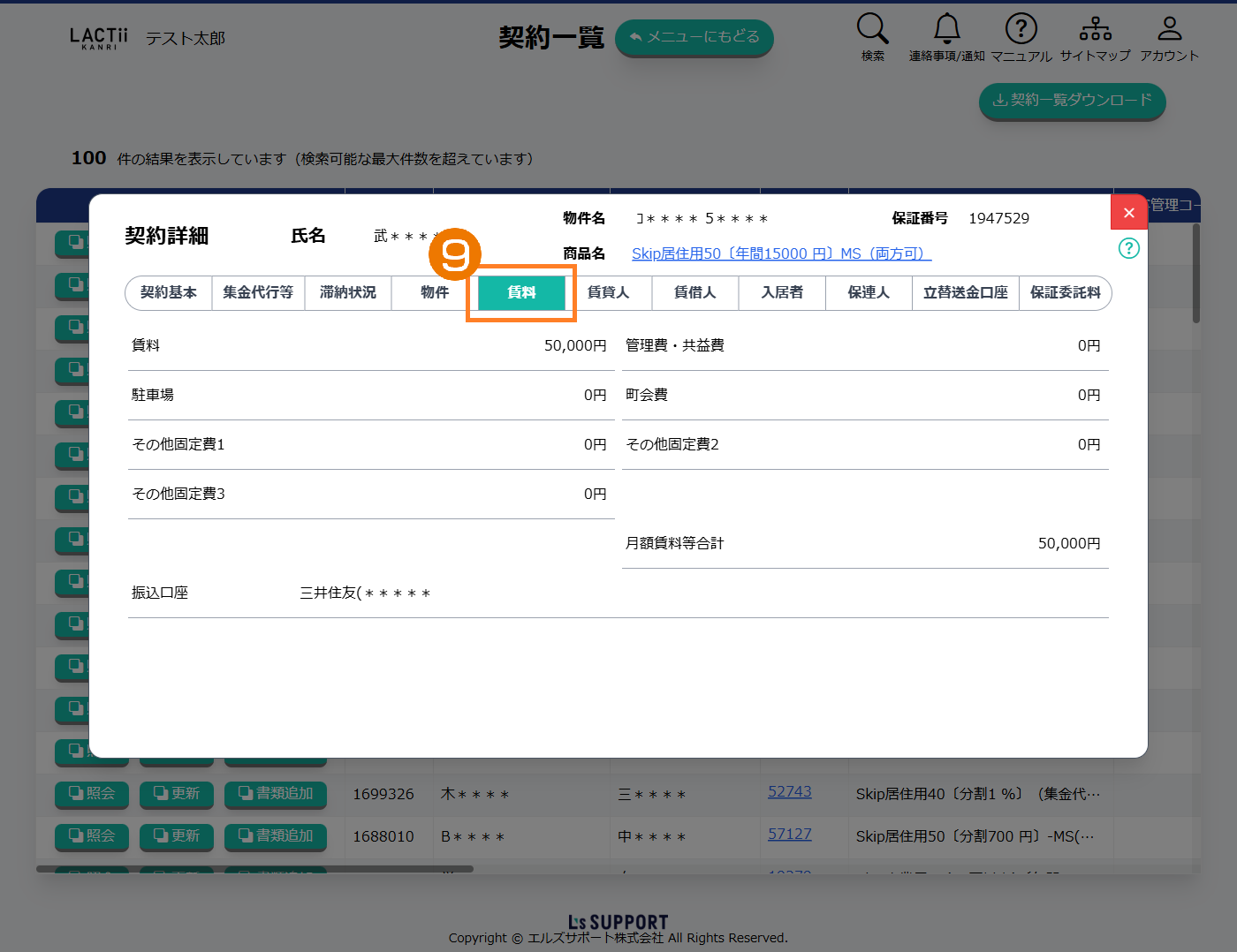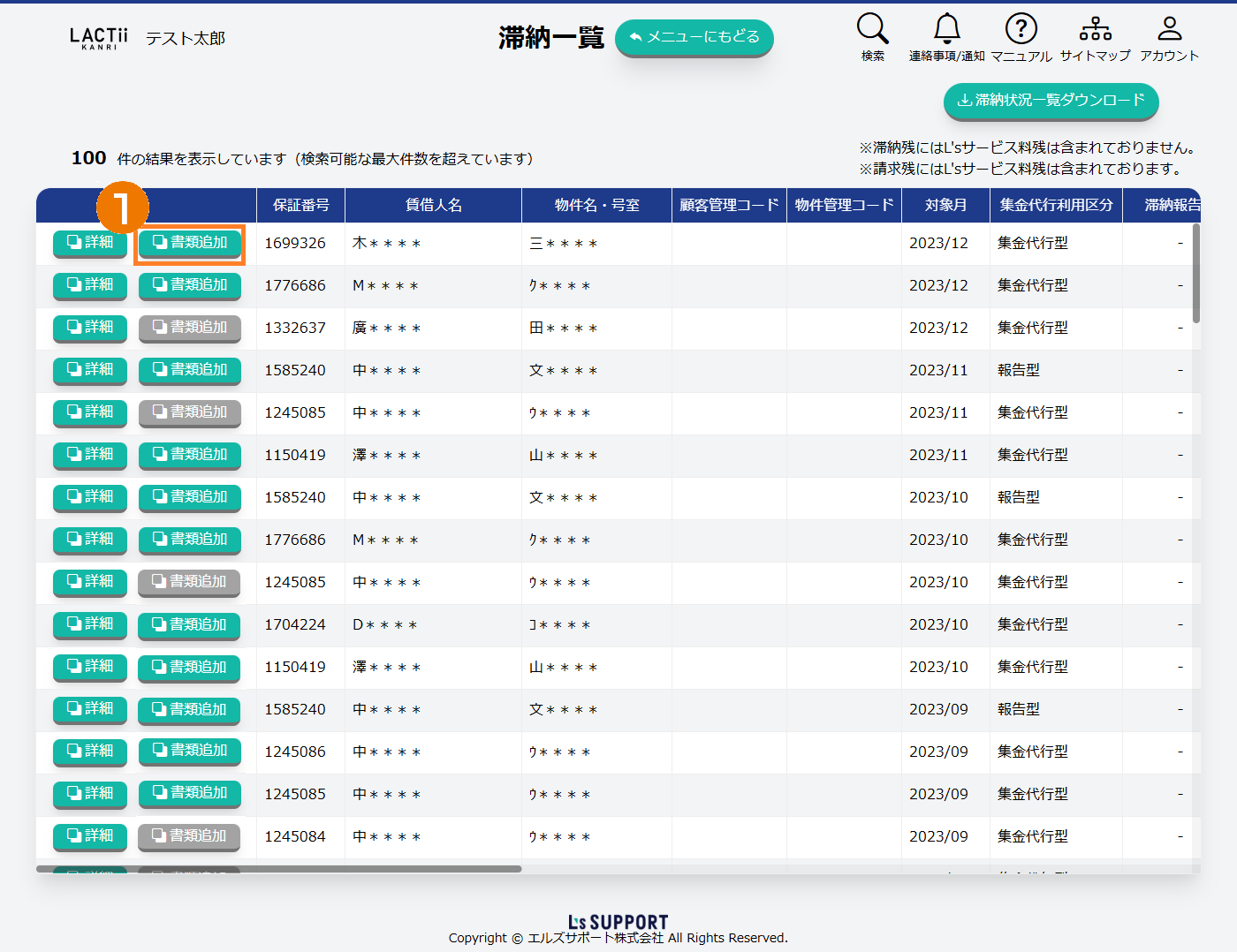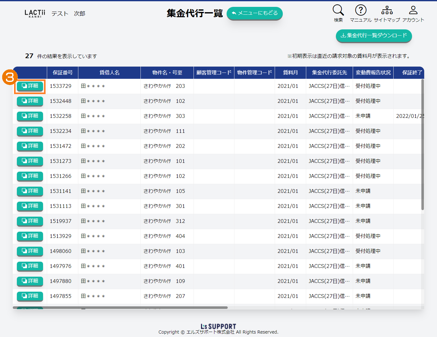 一覧画面で右にスクロールすることで月額賃料等合計、概算滞納月数、滞納残、L’sサービス料残、請求残、商品ID、商品名、集金代行利用区分、代理店名をご確認いただくことができます。
