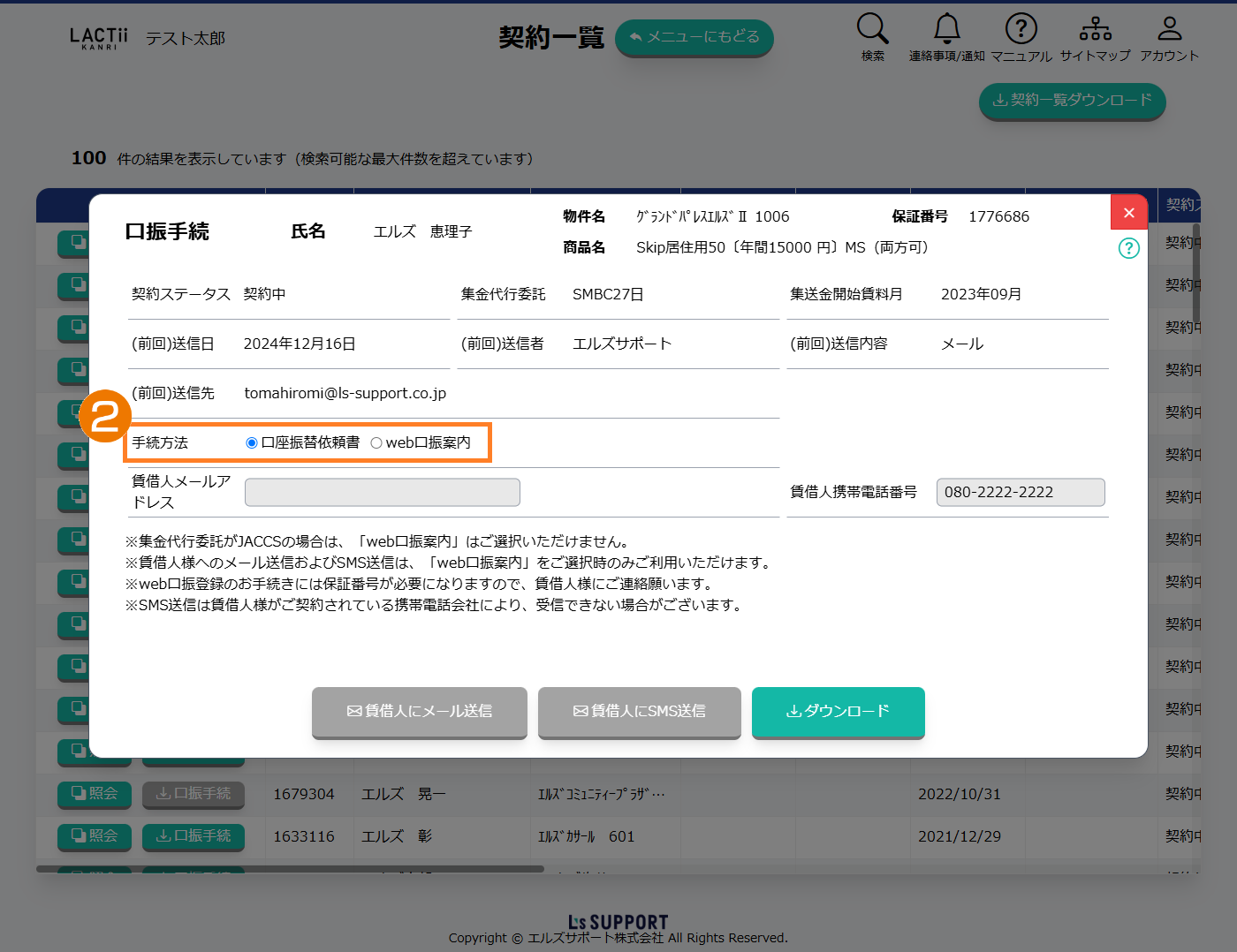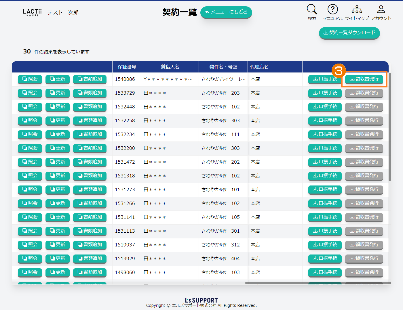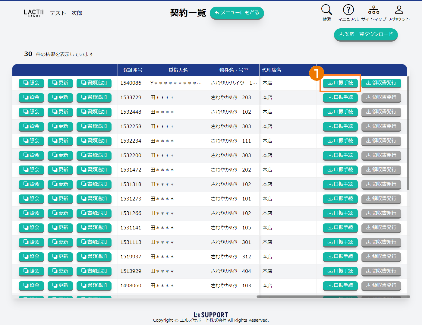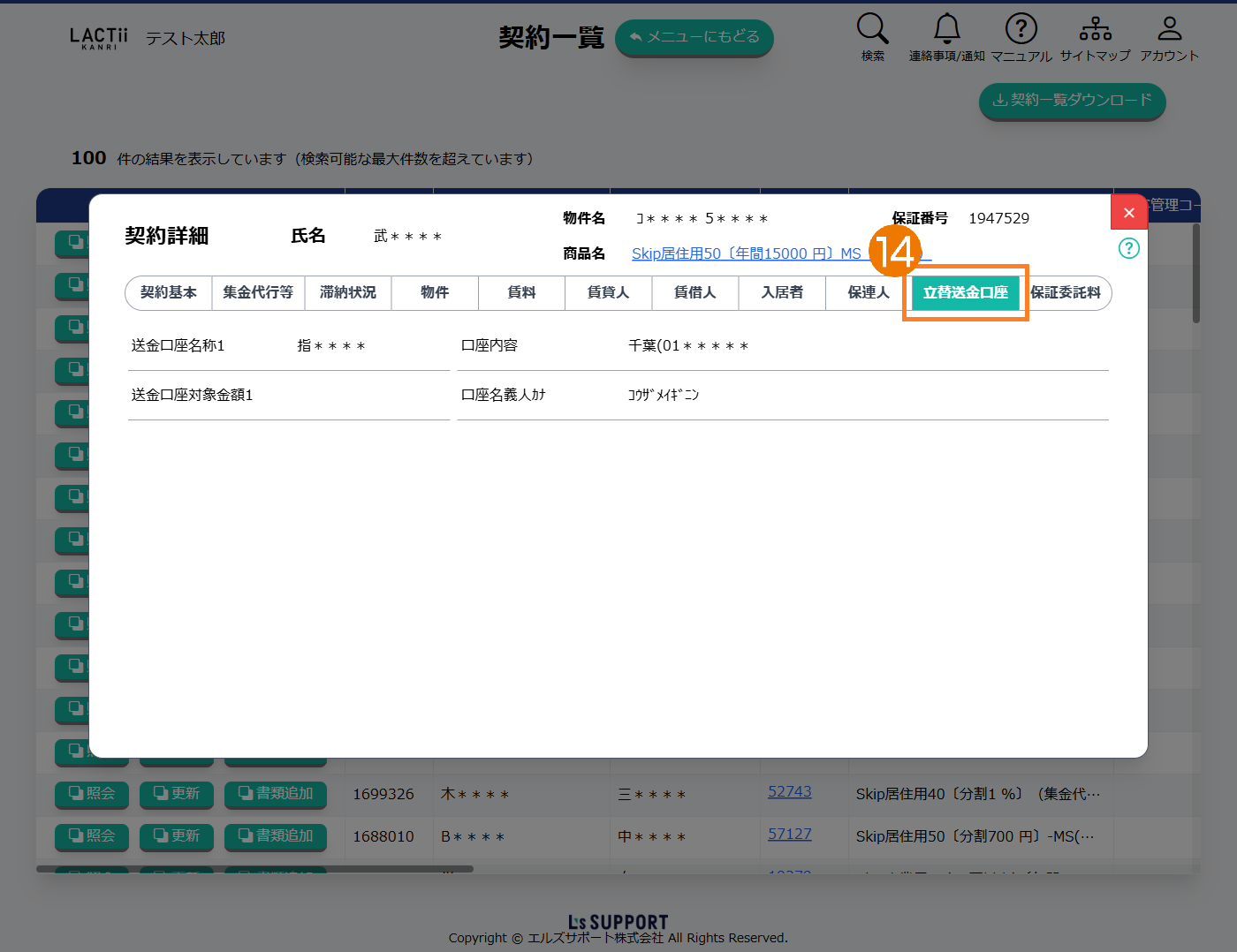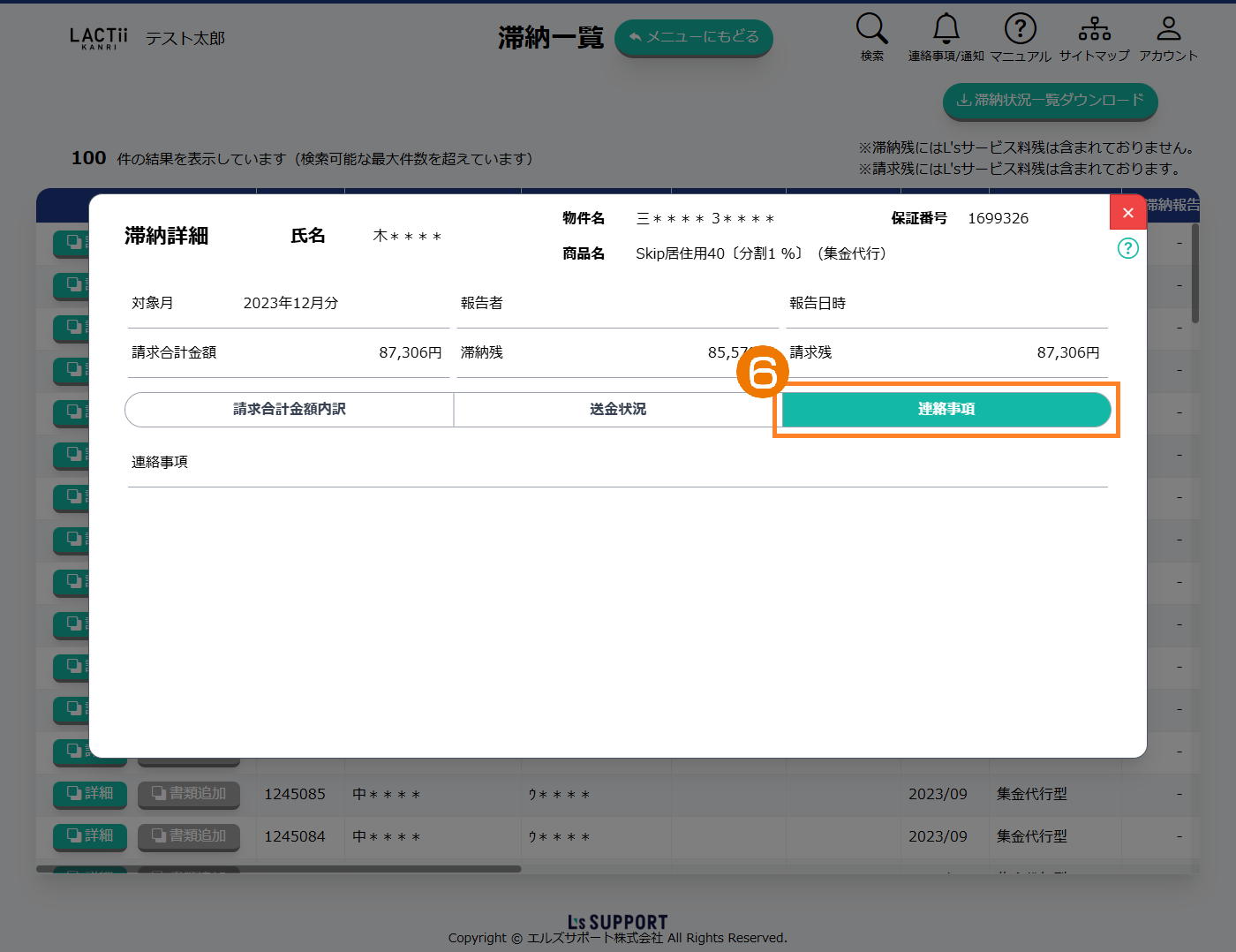 一覧画面で右にスクロールすることで月額賃料等合計、概算滞納月数、滞納残、L’sサービス料残、請求残、商品ID、商品名、集金代行利用区分、代理店名をご確認いただくことができます。