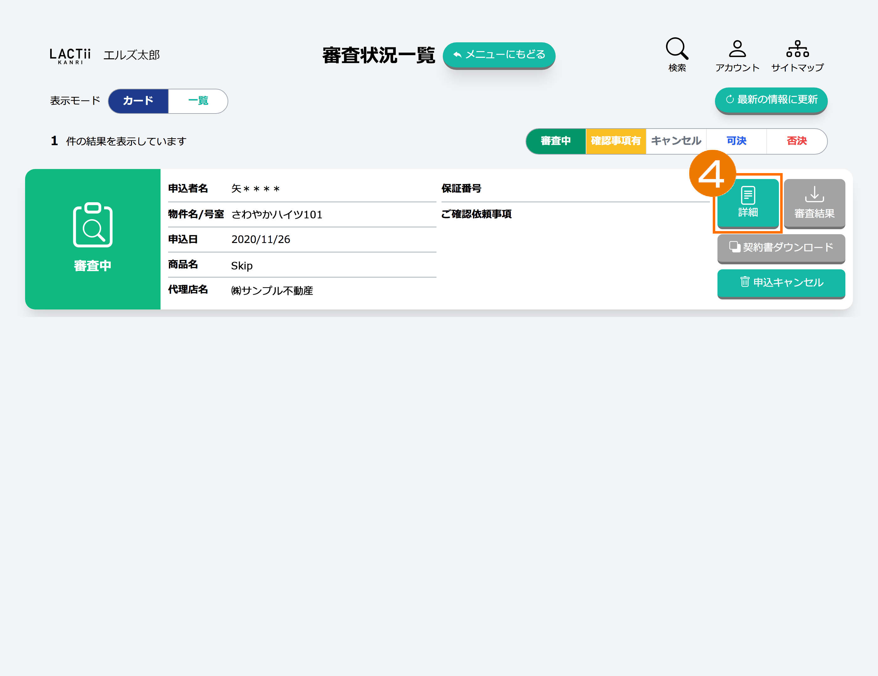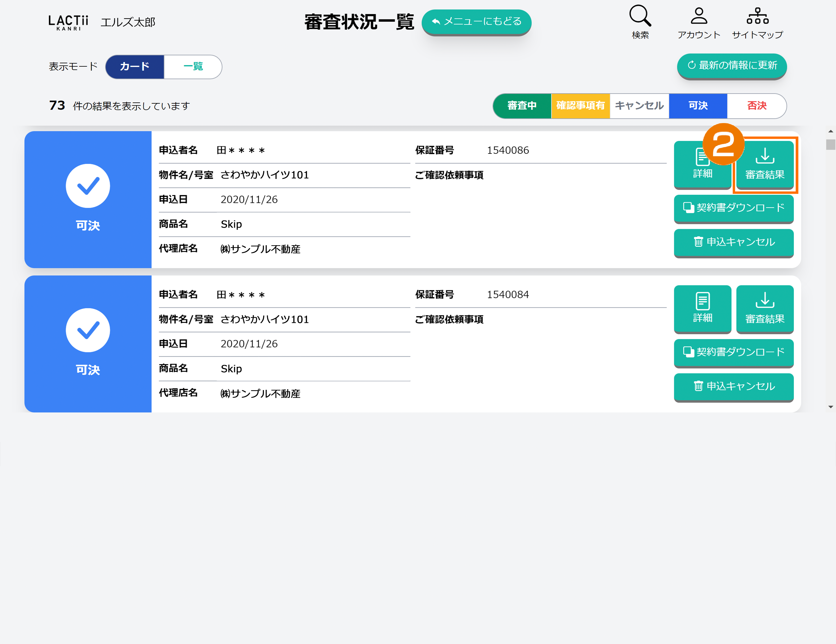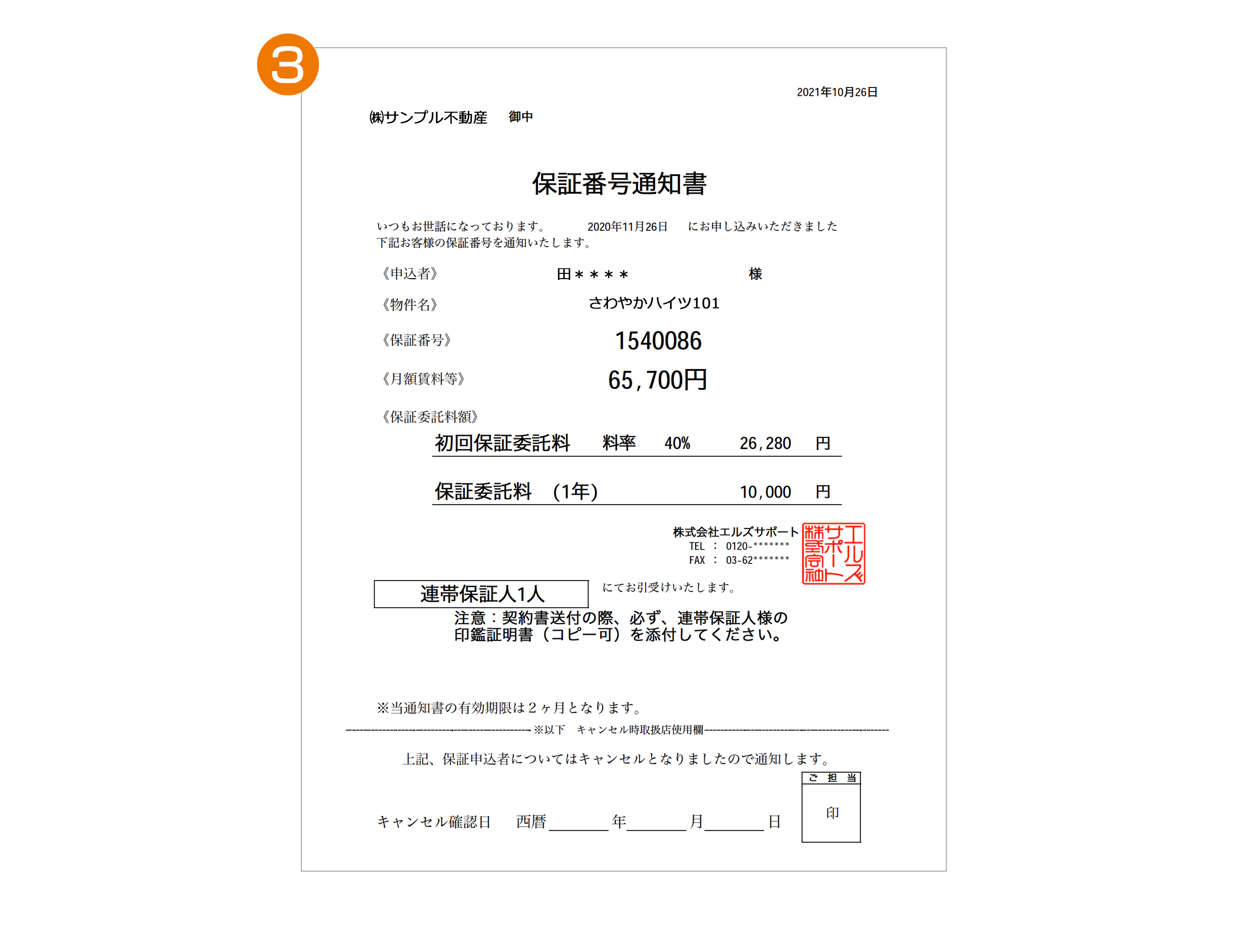承認の場合は保証番号通知書、否決の場合は保証否決通知書をご確認ください。