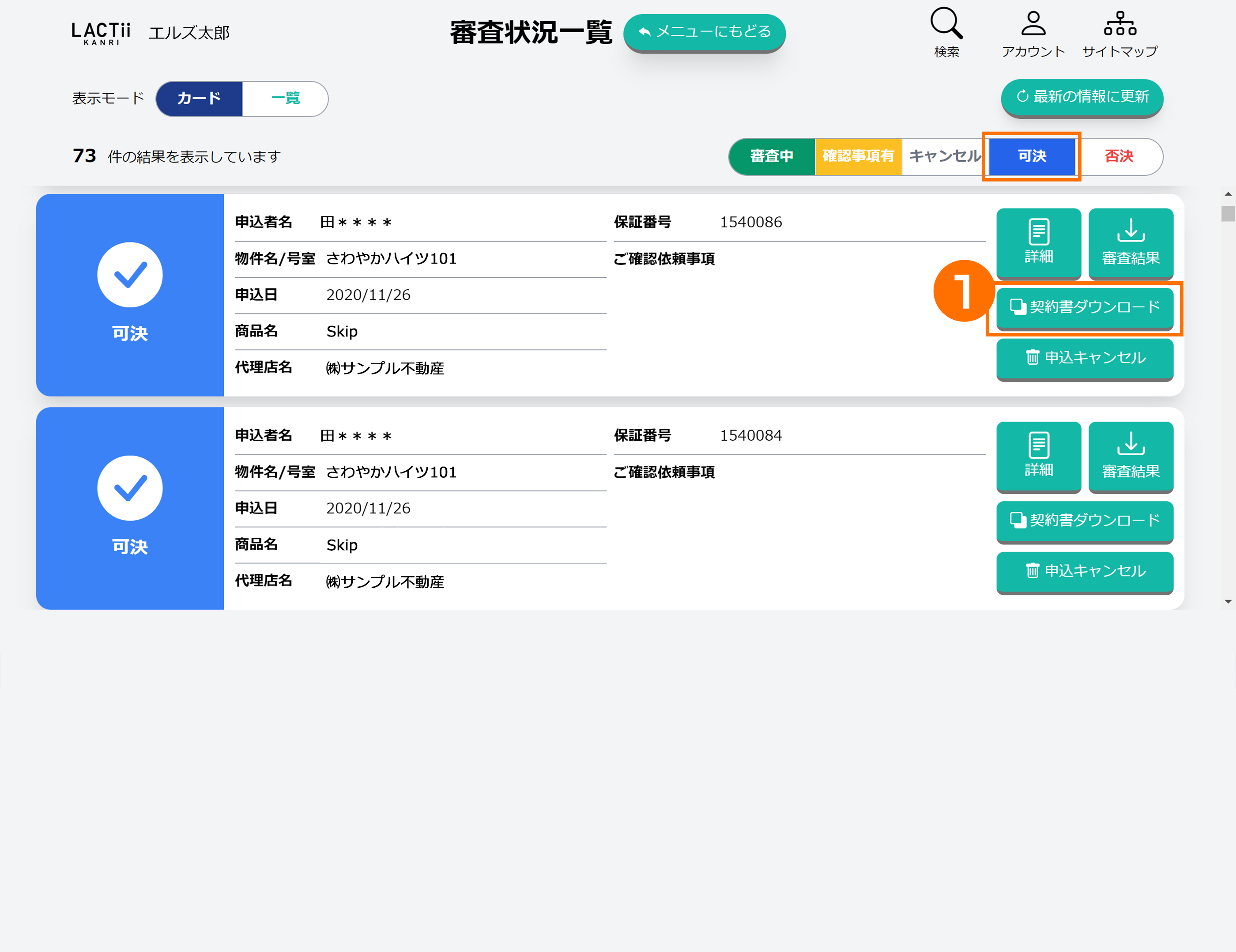 「可決」ステータスのみ「契約書ダウンロード」ボタンが押せます。