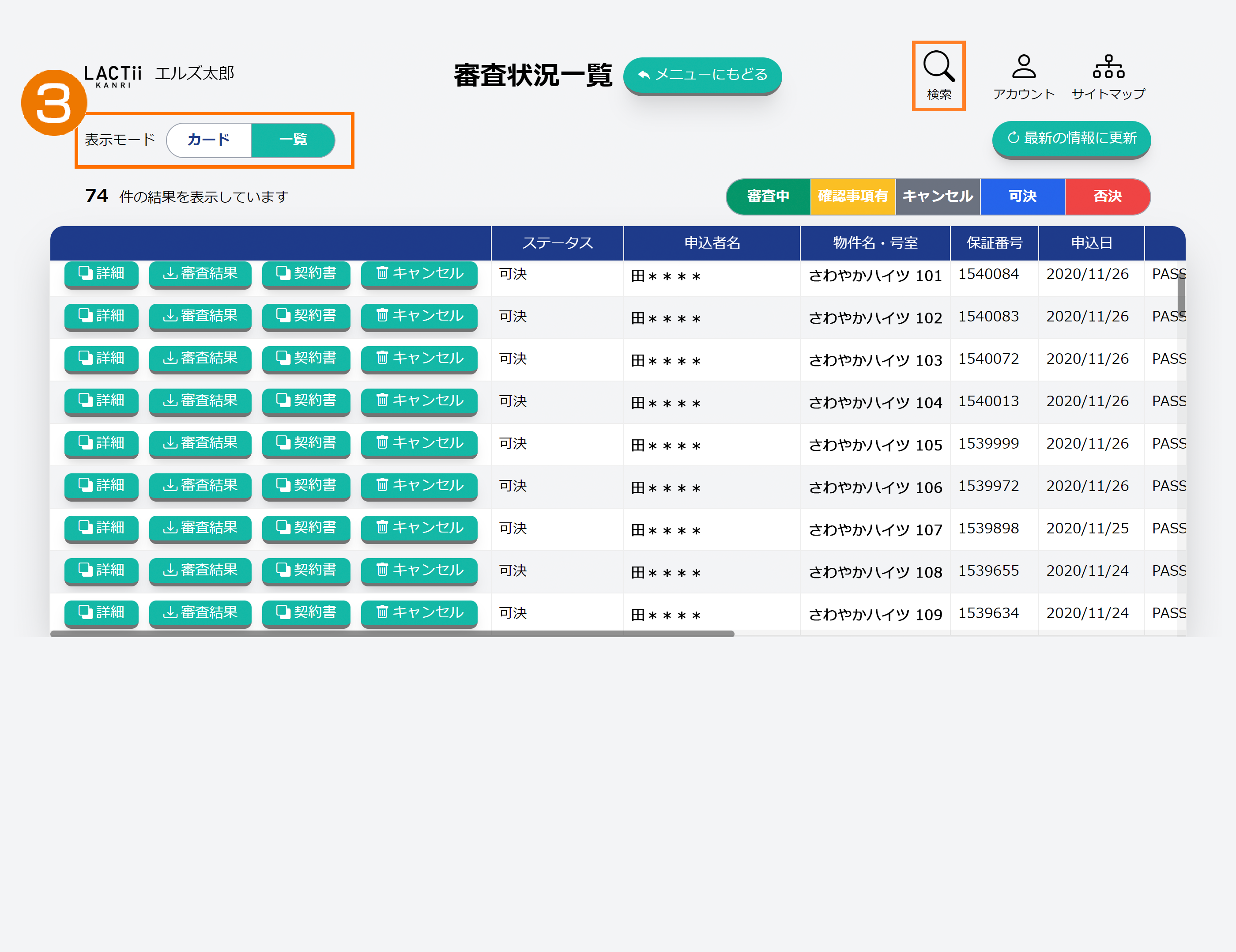 検索にて全数もしくは条件を絞ったリストを作成することができます。