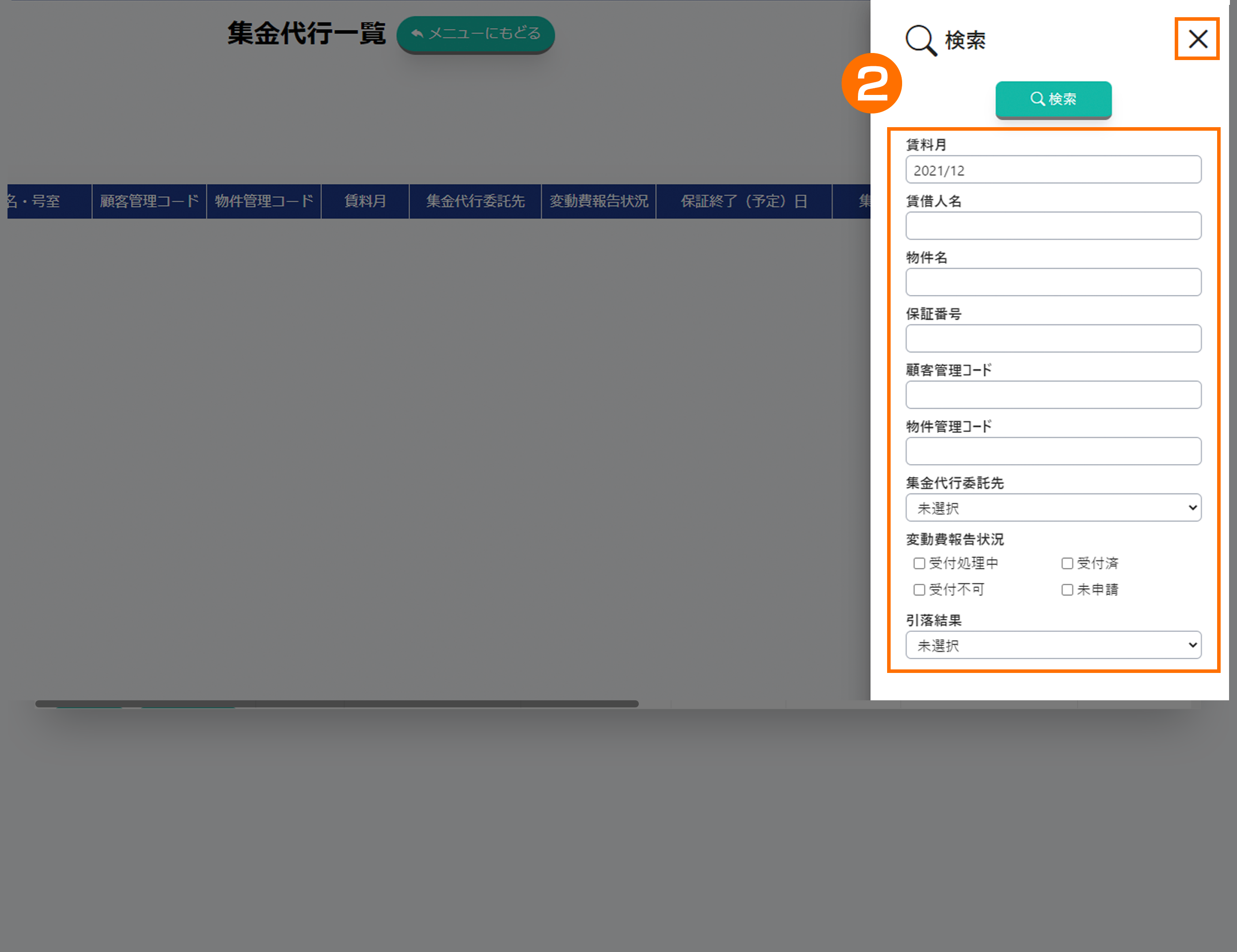 CSVファイルを出力する条件を選択及び入力し、検索ボタンを押下後、×(閉じる)ボタンで閉じます。