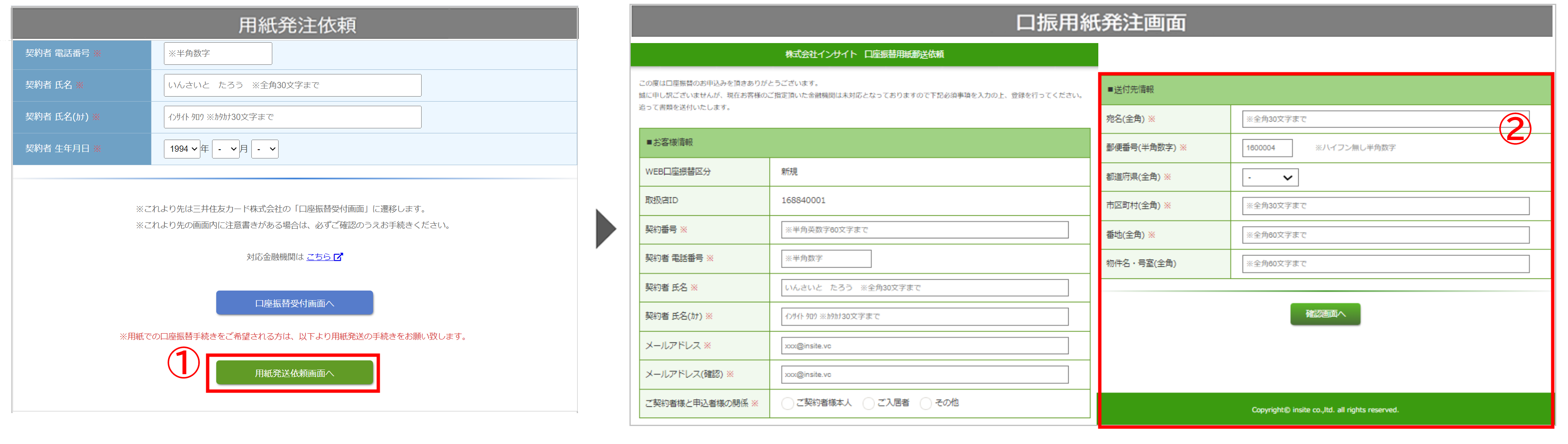 • 上記の登録手続き上にて、契約者様が紙の口座振替依頼書を希望した場合は、インサイト社より契約者様へ口座振替依頼書が送付されます。