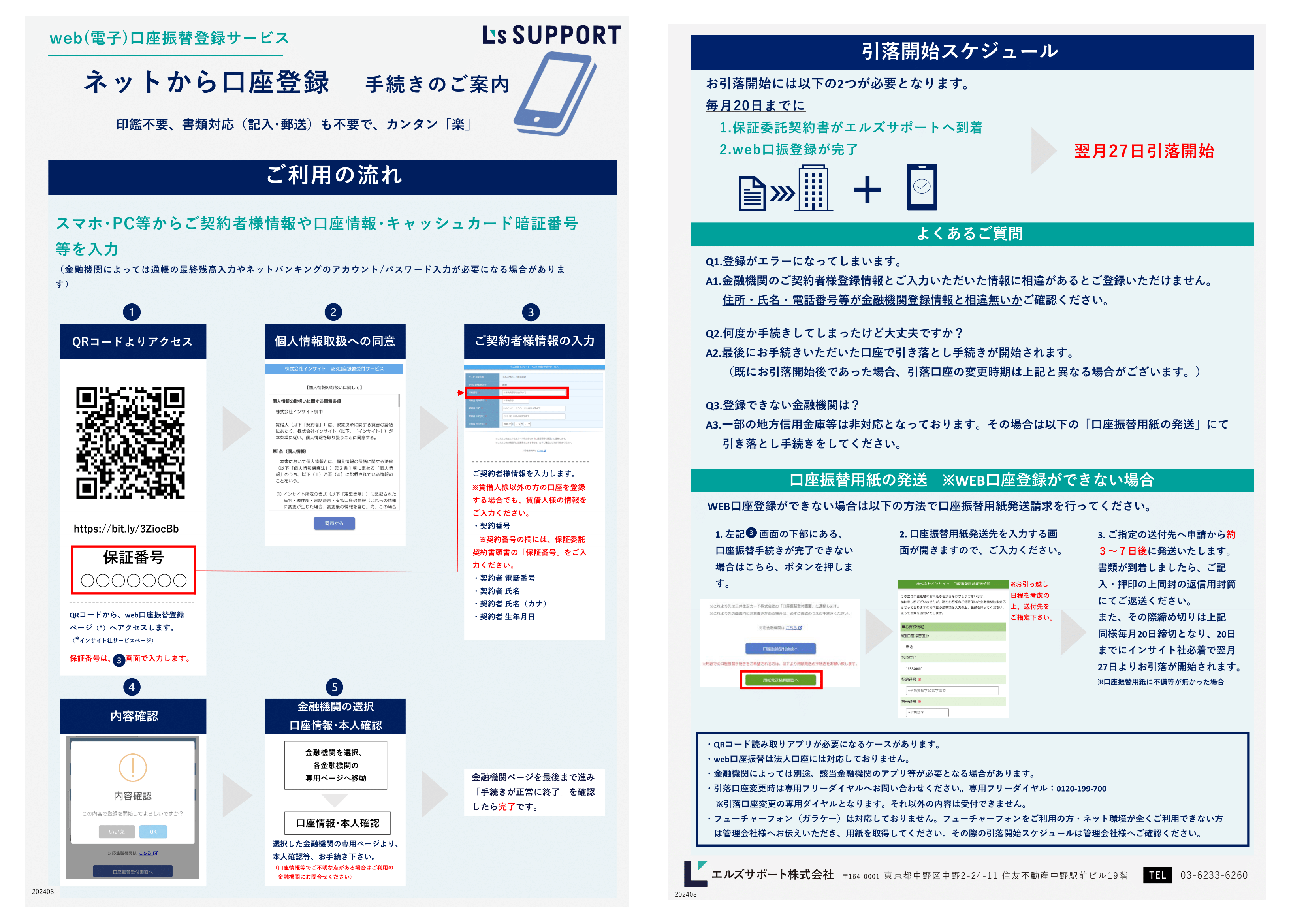 • 口座残高不足等で引落ができなかった場合、契約書記載の再請求事務手数料が発生します。また、後日当社より賃借人様にご連絡させていただきますので、代理店様や賃貸人様の口座へお支払いしないよう、お伝えください。