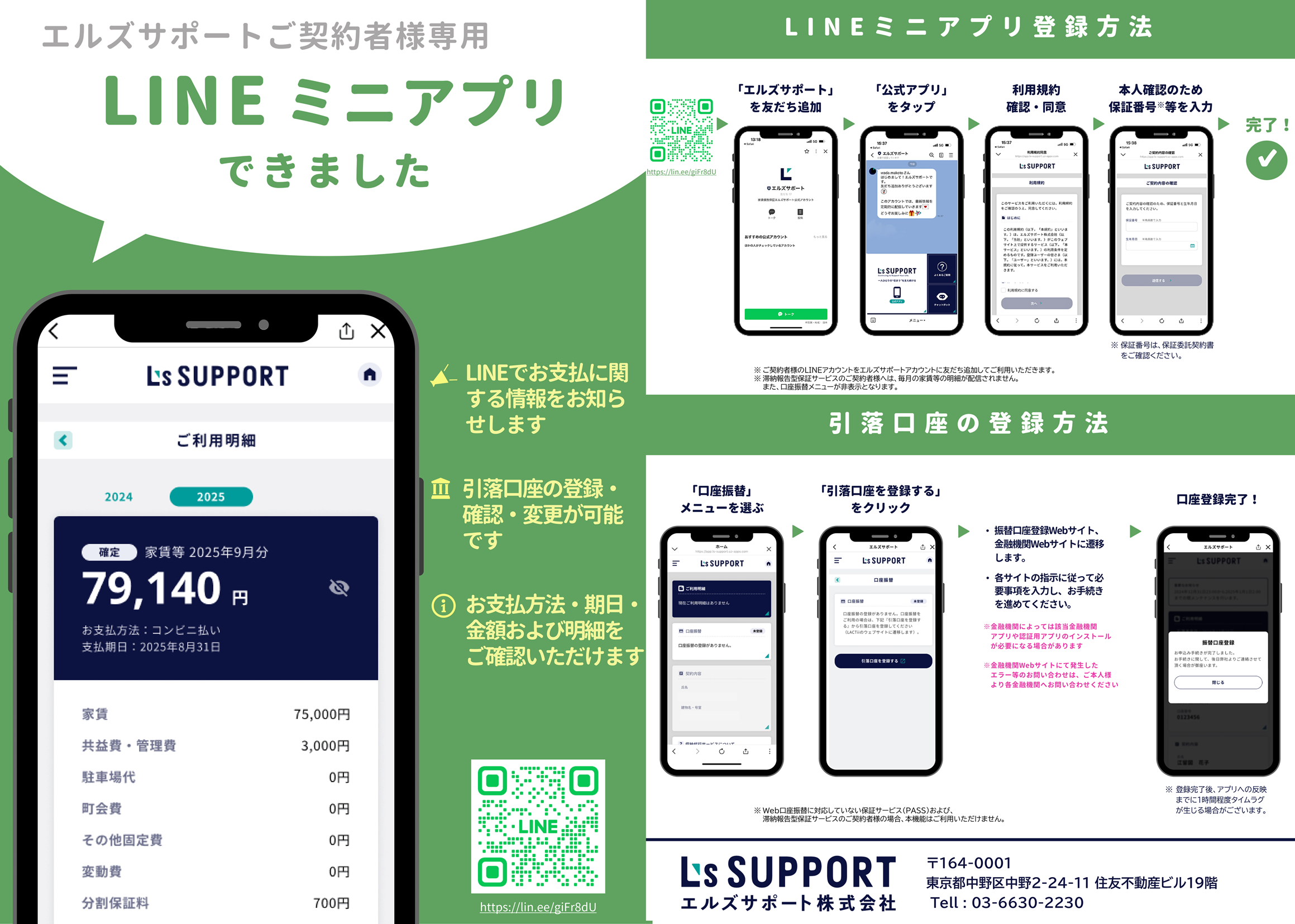 ※一度LINEミニアプリをご登録いただければ賃借人様自身で口座変更や確認、お支払い方法や金額などご確認いただけます。